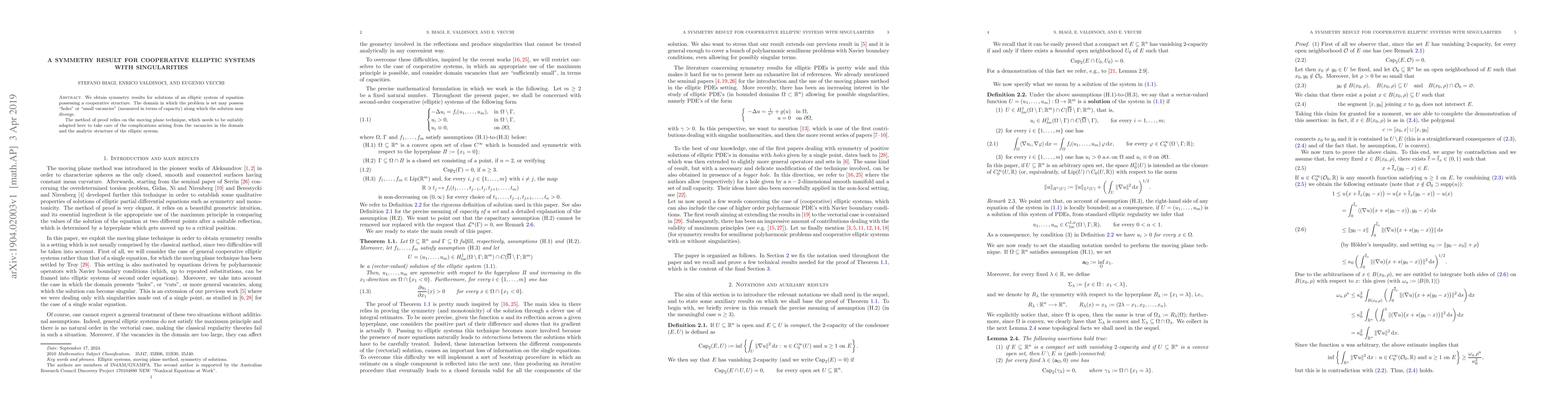 This paper presents symmetry results for solutions of cooperative elliptic systems with potential singularities, using an adapted moving plane method to handle domain vacancies and the system's analytic structure. The findings highlight the impact of domain irregularities on solution behavior.