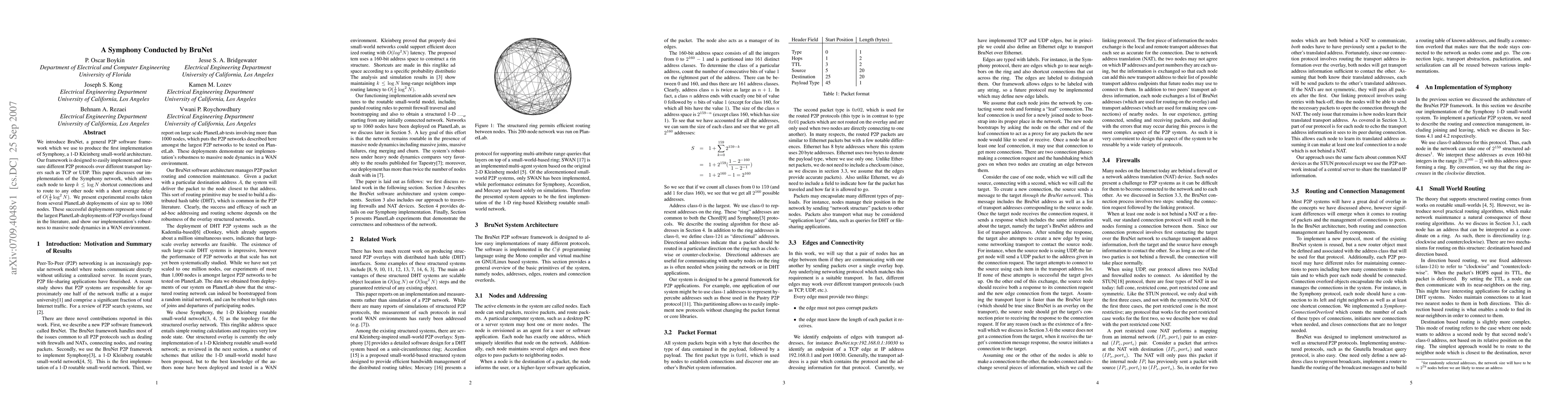 We introduce BruNet, a general P2P software framework which we use to produce the first implementation of Symphony, a 1-D Kleinberg small-world architecture. Our framework is designed to easily implement and measure different P2P protocols over different transport layers such as TCP or UDP. This paper discusses our implementation of the Symphony network, which allows each node to keep $k \le \log N$ shortcut connections and to route to any other node with a short average delay of $O(\frac{1}{k}\log^2 N)$. %This provides a continuous trade-off between node degree and routing latency. We present experimental results taken from several PlanetLab deployments of size up to 1060 nodes. These succes sful deployments represent some of the largest PlanetLab deployments of P2P overlays found in the literature, and show our implementation's robustness to massive node dynamics in a WAN environment.