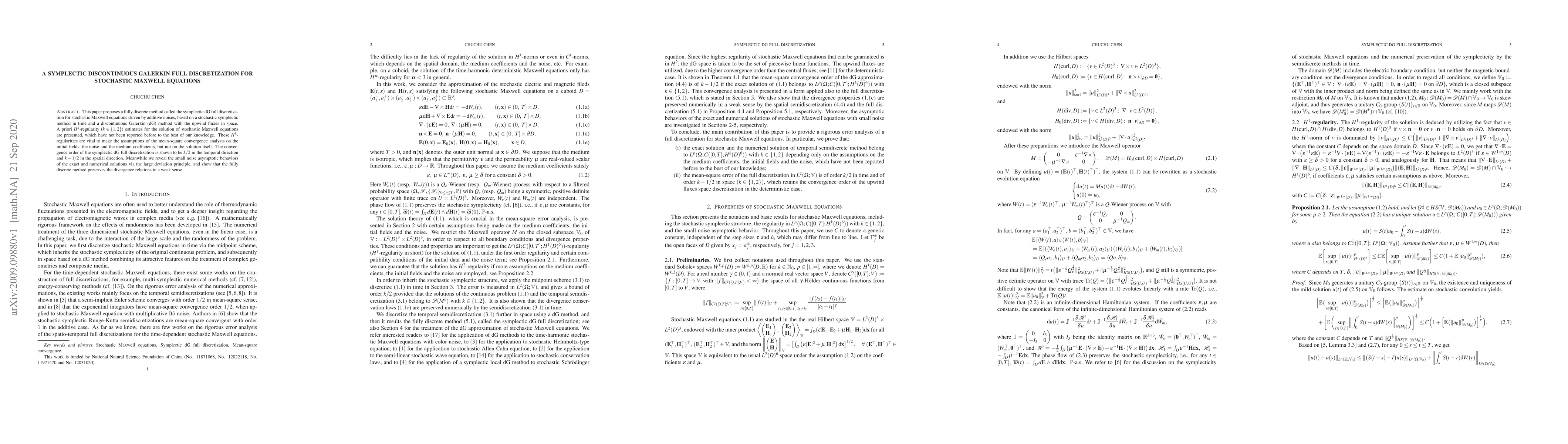 This paper introduces a symplectic discontinuous Galerkin method for stochastic Maxwell equations, achieving $H^k$-regularity estimates and demonstrating convergence orders. It also preserves the divergence relations and reveals small noise asymptotic behaviors via the large deviation principle.