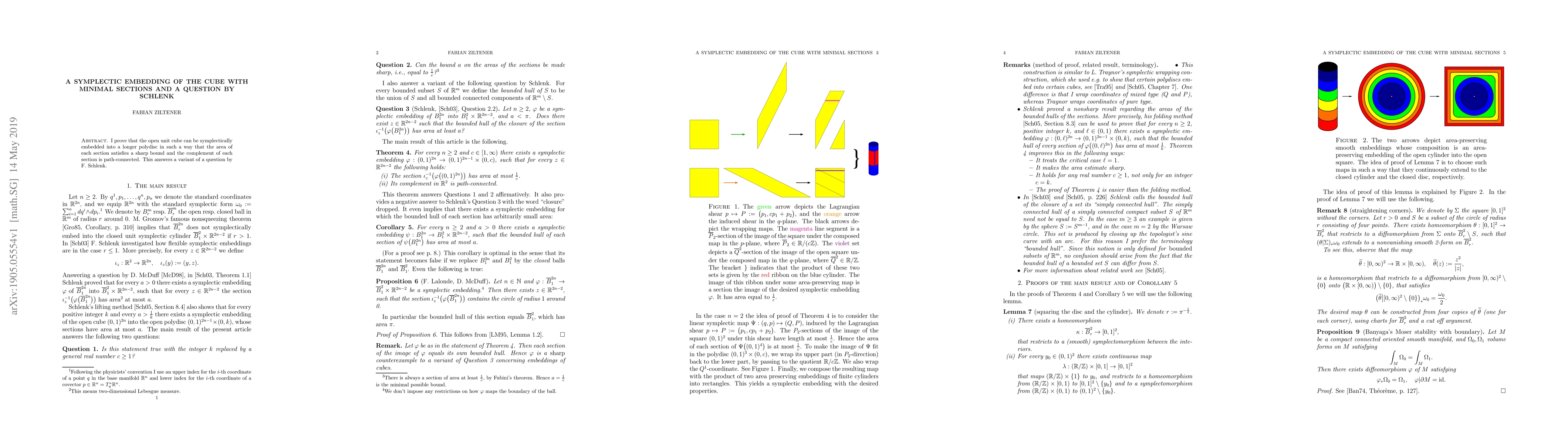 I prove that the open unit cube can be symplectically embedded into a longer polydisc in such a way that the area of each section satisfies a sharp bound and the complement of each section is path-connected. This answers a variant of a question by F. Schlenk.