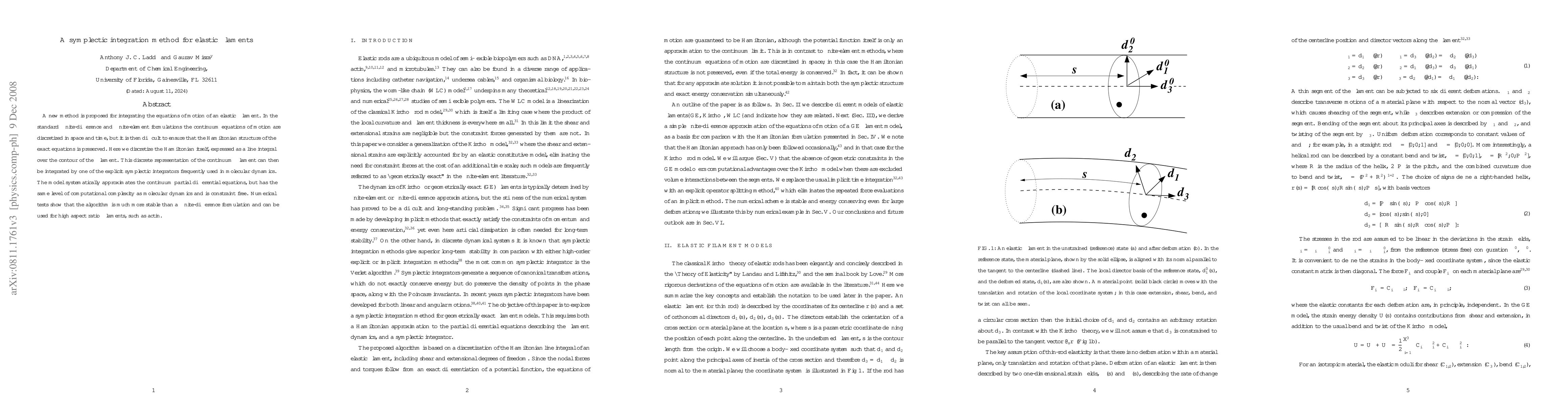 A new method is proposed for integrating the equations of motion of an elastic filament. In the standard finite-difference and finite-element formulations the continuum equations of motion are discretized in space and time, but it is then difficult to ensure that the Hamiltonian structure of the exact equations is preserved. Here we discretize the Hamiltonian itself, expressed as a line integral over the contour of the filament. This discrete representation of the continuum filament can then be integrated by one of the explicit symplectic integrators frequently used in molecular dynamics. The model systematically approximates the continuum partial differential equations, but has the same level of computational complexity as molecular dynamics and is constraint free. Numerical tests show that the algorithm is much more stable than a finite-difference formulation and can be used for high aspect ratio filaments, such as actin.
