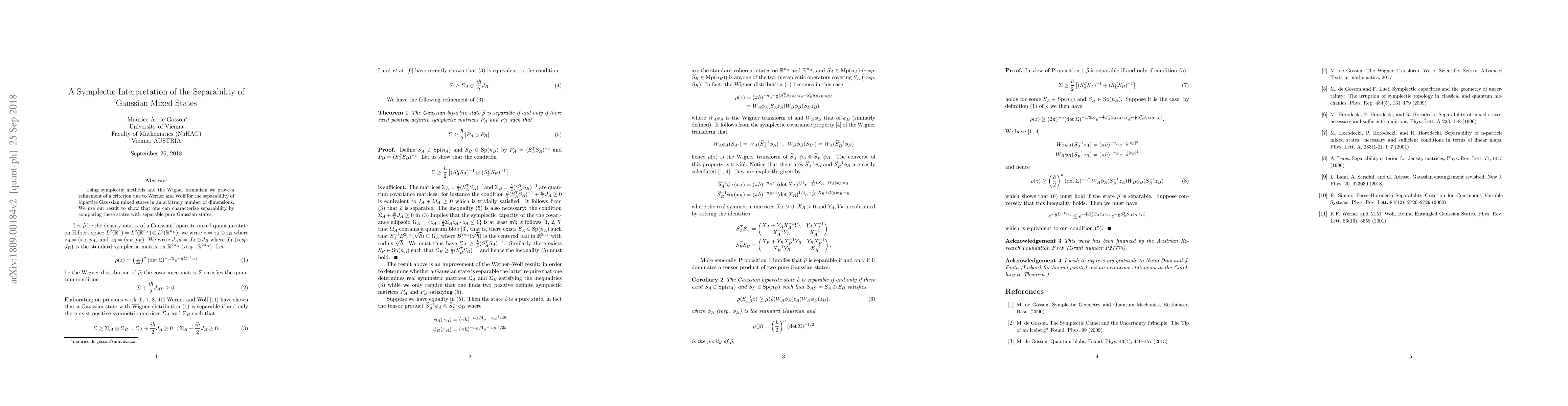 We prove, using symplectic methods and The Wigner formalism, a refinement of a criterion due to Werner and Wolf for the separability of bipartite Gaussian mixed states in an arbitrary number of dimensions. We use our result to show that one can characterize separability by comparing these states with separable pure Gaussian states.