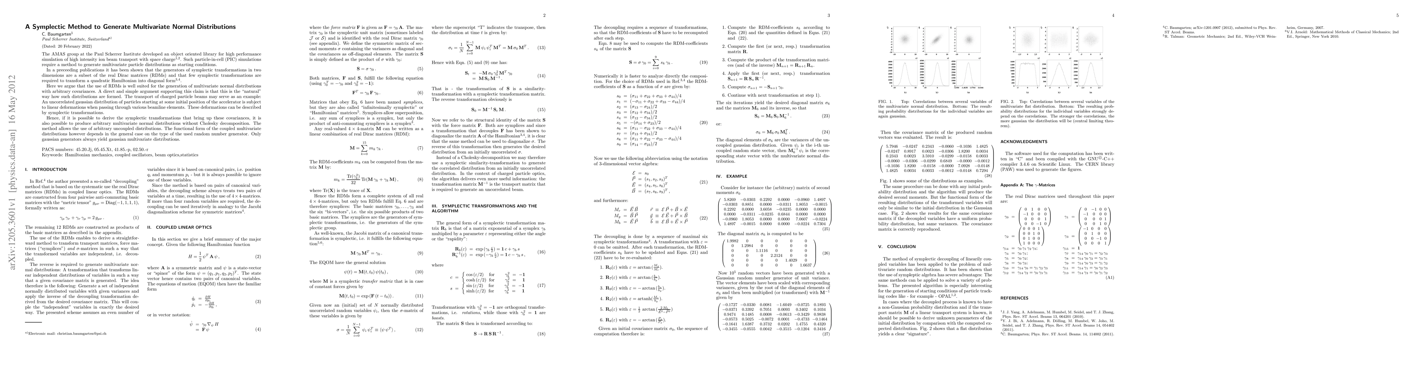 The AMAS group at the Paul Scherrer Institute developed an object oriented library for high performance simulation of high intensity ion beam transport with space charge. Such particle-in-cell (PIC) simulations require a method to generate multivariate particle distributions as starting conditions. In a preceeding publications it has been shown that the generators of symplectic transformations in two dimensions are a subset of the real Dirac matrices (RDMs) and that few symplectic transformations are required to transform a quadratic Hamiltonian into diagonal form. Here we argue that the use of RDMs is well suited for the generation of multivariate normal distributions with arbitrary covariances. A direct and simple argument supporting this claim is that this is the "natural" way how such distributions are formed. The transport of charged particle beams may serve as an example: An uncorrelated gaussian distribution of particles starting at some initial position of the accelerator is subject to linear deformations when passing through various beamline elements. These deformations can be described by symplectic transformations. Hence, if it is possible to derive the symplectic transformations that bring up these covariances, it is also possible to produce arbitrary multivariate normal distributions without Cholesky decomposition. The method allows the use of arbitrary uncoupled distributions. The functional form of the coupled multivariate distributions however depends in the general case on the type of the used random number generator. Only gaussian generators always yield gaussian multivariate distributions.