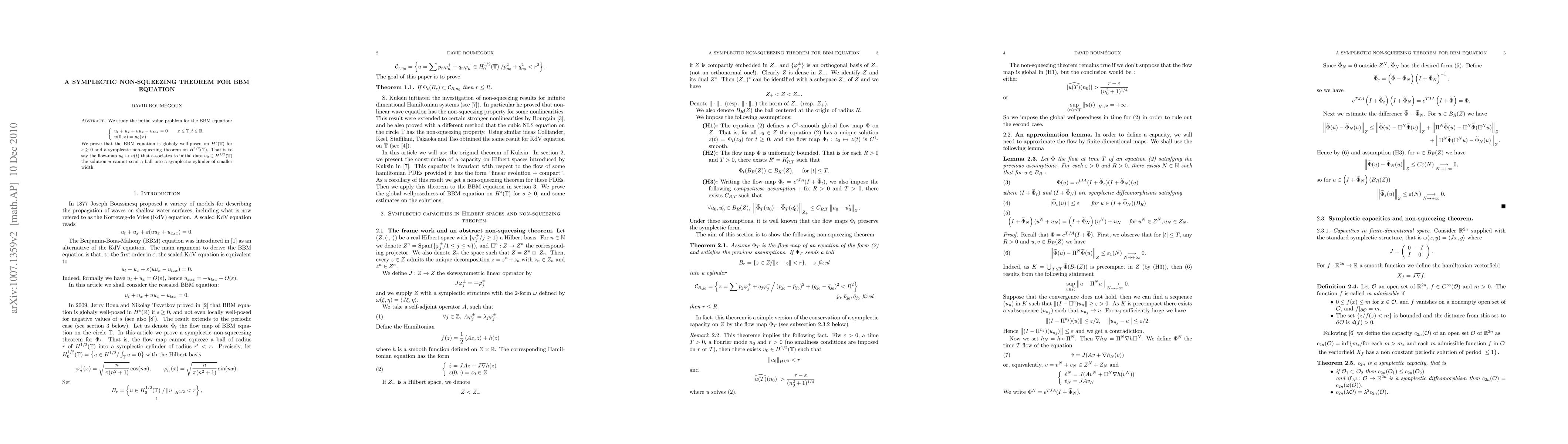 We study the initial value problem for the BBM equation: $$\left\{\begin{array}{l} u_t+u_x+uu_x-u_{txx}=0 \qquad x\in \T, t \in \R u(0,x)=u_0(x) \end{array} \right. .$$ We prove that the BBM equation is globaly well-posed on $H^s(\T)$ for $s\geq0$ and a symplectic non-squeezing theorem on $H^{1/2}(\T)$. That is to say the flow-map $u_0 \mapsto u(t)$ that associates to initial data $u_0 \in H^{1/2}(\T)$ the solution $u$ cannot send a ball into a symplectic cylinder of smaller width.