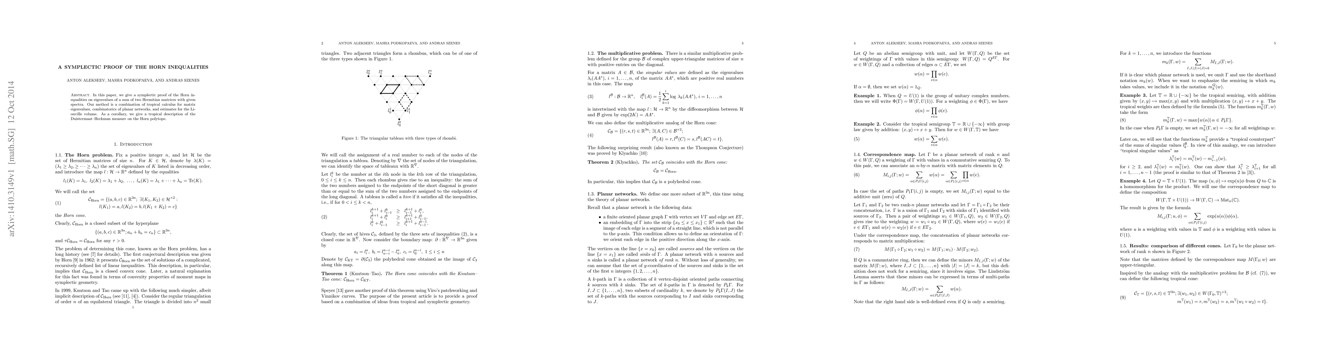 In this paper, we give a symplectic proof of the Horn inequalities on eigenvalues of a sum of two Hermitian matrices with given spectra. Our method is a combination of tropical calculus for matrix eigenvalues, combinatorics of planar networks, and estimates for the Liouville volume. As a corollary, we give a tropical description of the Duistermaat-Heckman measure on the Horn polytope.