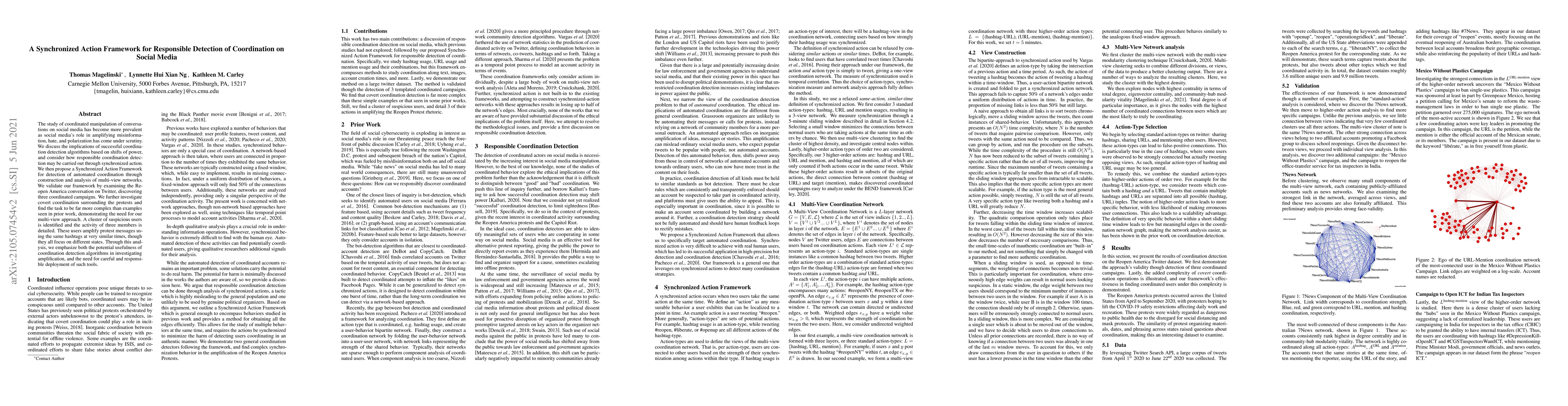 The study of coordinated manipulation of conversations on social media has become more prevalent as social media's role in amplifying misinformation, hate, and polarization has come under scrutiny. We discuss the implications of successful coordination detection algorithms based on shifts of power, and consider how responsible coordination detection may be carried out through synchronized action. We then propose a Synchronized Action Framework for detection of automated coordination through construction and analysis of multi-view networks. We validate our framework by examining the Reopen America conversation on Twitter, discovering three coordinated campaigns. We further investigate covert coordination surrounding the protests and find the task to be far more complex than examples seen in prior work, demonstrating the need for our multi-view approach. A cluster of suspicious users is identified and the activity of three members is detailed. These users amplify protest messages using the same hashtags at very similar times, though they all focus on different states. Through this analysis, we emphasize both the potential usefulness of coordination detection algorithms in investigating amplification, and the need for careful and responsible deployment of such tools.