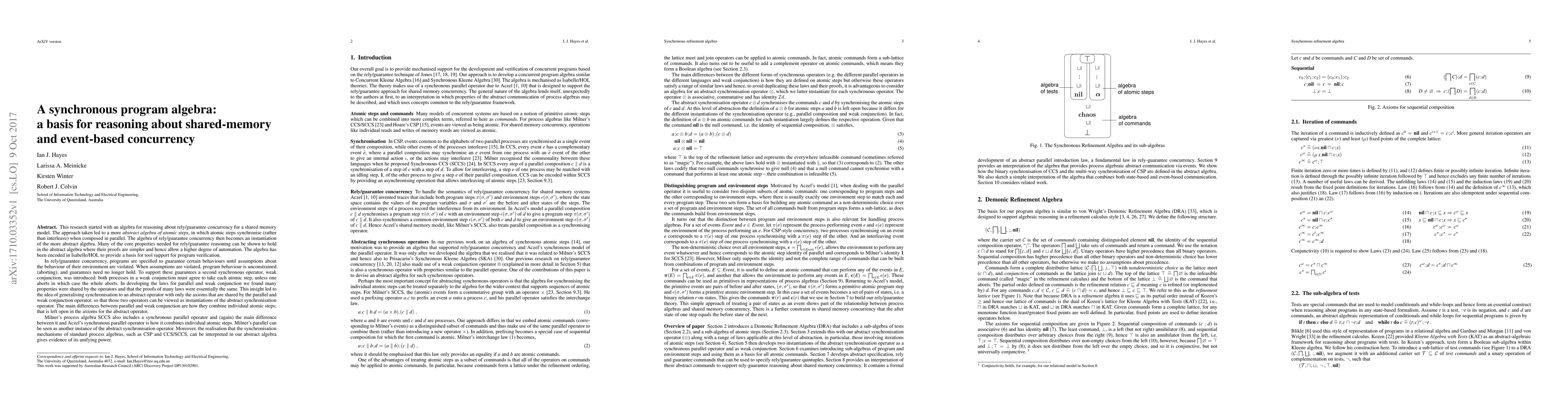 This research started with an algebra for reasoning about rely/guarantee concurrency for a shared memory model. The approach taken led to a more abstract algebra of atomic steps, in which atomic steps synchronise (rather than interleave) when composed in parallel. The algebra of rely/guarantee concurrency then becomes an instantiation of the more abstract algebra. Many of the core properties needed for rely/guarantee reasoning can be shown to hold in the abstract algebra where their proofs are simpler and hence allow a higher degree of automation. The algebra has been encoded in Isabelle/HOL to provide a basis for tool support for program verification. In rely/guarantee concurrency, programs are specified to guarantee certain behaviours until assumptions about the behaviour of their environment are violated. When assumptions are violated, program behaviour is unconstrained (aborting), and guarantees need no longer hold. To support these guarantees a second synchronous operator, weak conjunction, was introduced: both processes in a weak conjunction must agree to take each atomic step, unless one aborts in which case the whole aborts. In developing the laws for parallel and weak conjunction we found many properties were shared by the operators and that the proofs of many laws were essentially the same. This insight led to the idea of generalising synchronisation to an abstract operator with only the axioms that are shared by the parallel and weak conjunction operator, so that those two operators can be viewed as instantiations of the abstract synchronisation operator. The main differences between parallel and weak conjunction are how they combine individual atomic steps; that is left open in the axioms for the abstract operator.