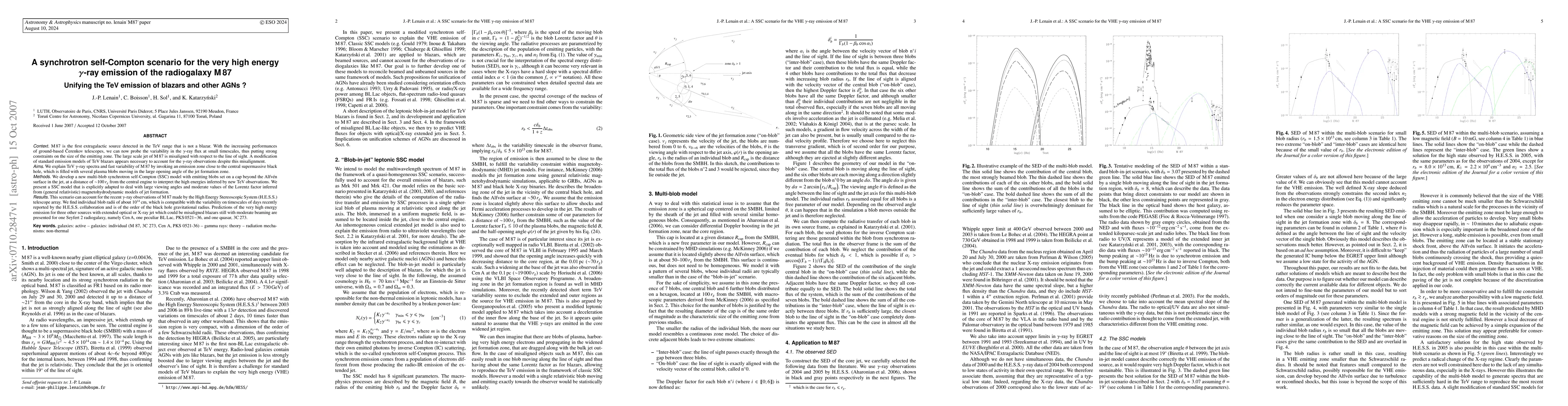 M87 is the first extragalactic source detected in the TeV range that is not a blazar. With the increasing performances of ground-based Cherenkov telescopes, we can now probe the variability in the gamma-ray flux at small timescales, thus putting strong constraints on the size of the emitting zone. A modification of standard emission models of TeV blazars appears necessary to account for the gamma-ray observations despite this misalignment. We explain TeV gamma-ray spectra and fast variability of M87 by invoking an emission zone close to the central supermassive black hole, which is filled with several plasma blobs moving in the large opening angle of the jet formation zone. We develop a new multi-blob synchrotron self-Compton (SSC) model with emitting blobs beyond the Alfven surface in the jet, at a distance of about 100 r_g from the central engine. This model is explicitly adapted to deal with large viewing angles and moderate values of the Lorentz factor inferred from (general relativistic) magnetohydrodynamic models of jet formation. This scenario can account for the recent gamma-ray observations of M87 made by the High Energy Stereoscopic System (H.E.S.S.) telescope array. We find individual blob radii of about 10^{14} cm, which is compatible with the variability on timescales of days recently reported by the H.E.S.S. collaboration and is of the order of the black hole gravitational radius. Predictions of the very high energy emission for three other sources with extended optical or X-ray jet which could be misaligned blazars still with moderate beaming are presented for one Seyfert 2 radiogalaxy, namely Cen A, one peculiar BL Lac, PKS 0521-36, and one quasar, 3C 273.