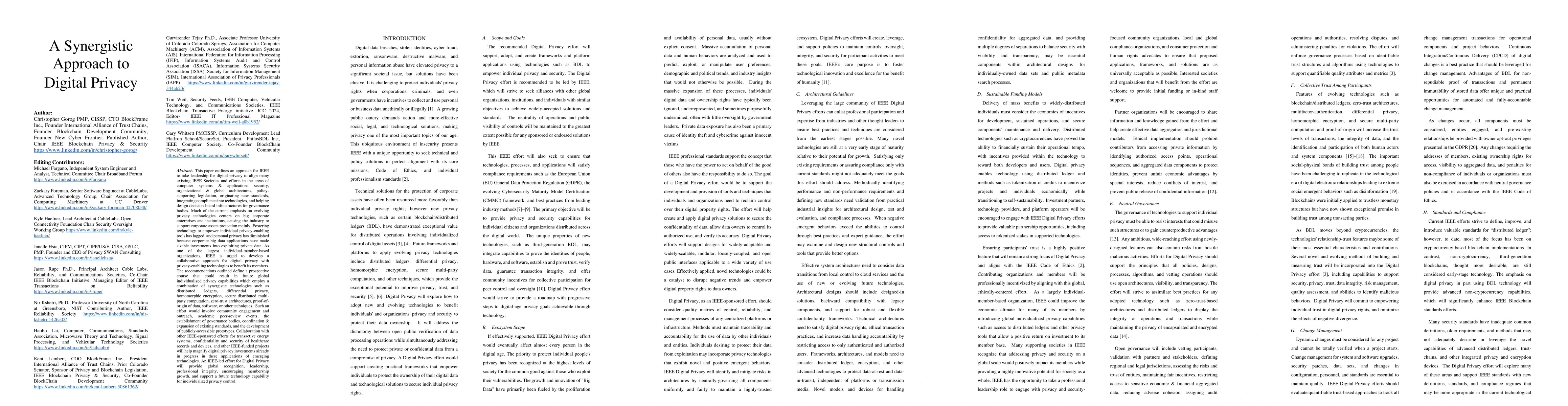 This paper outlines an approach for IEEE to take leadership for digital privacy to align many existing IEEE Societies and efforts in the areas of computer systems & applications security, organizational & global architectures, policy-supporting legislation, originating new standards, integrating compliance into technologies, and helping design decision-board infrastructures for governance bodies. Much of the current emphasis on evolving privacy technologies centers on big corporate enterprises and institutions, causing the industry to support corporate assets protection mainly. Fostering technology to empower individual privacy-enabling tools has lagged, and personal privacy has diminished because corporate big data applications have made sizable investments into exploiting private data. As one of the largest individual-member-based organizations, IEEE is urged to develop a collaborative approach for digital privacy with privacy-enabling technologies to benefit its members. The recommendations outlined define a prospective course that could result in future global individualized privacy capabilities which employ a combination of synergistic technologies such as distributed ledgers, differential privacy, homomorphic encryption, secure distributed multi-party computation, zero-trust architectures, proof-of-origin of data, software, or other techniques. Such an effort would involve community engagement and outreach, academic peer-review events, the establishment of governance bodies, coordination & expansion of existing standards, and the development of publicly-accessible prototypes. Collaboration with other IEEE-sponsored efforts for transactive energy systems, confidentiality and security of healthcare records and devices, and other IEEE-funded projects will help magnify digital privacy investments already in progress in these applications of emerging technologies.