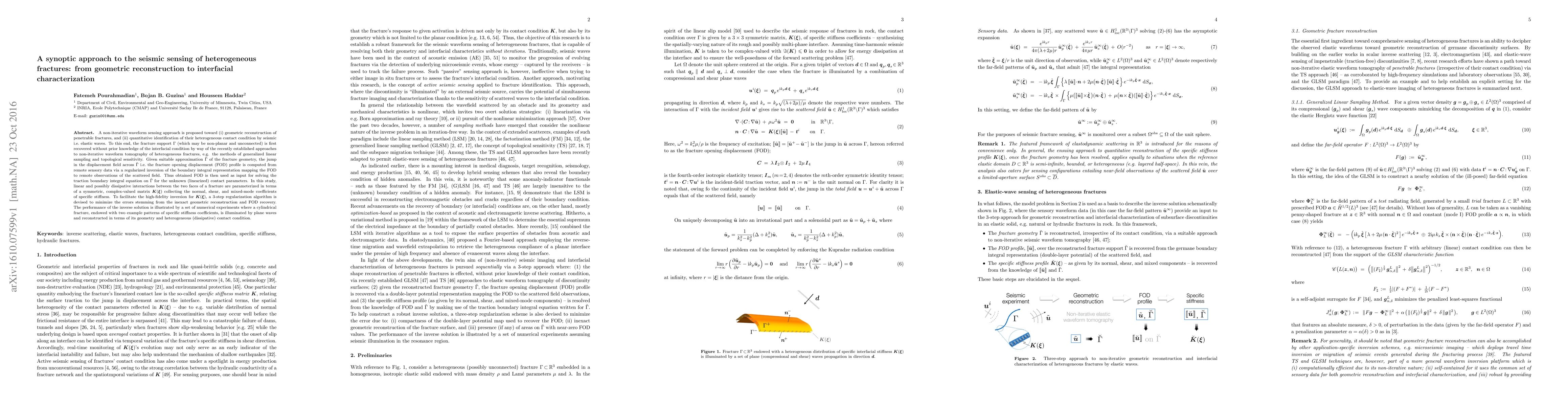 A non-iterative waveform sensing approach is proposed toward (i) geometric reconstruction of penetrable fractures, and (ii) quantitative identification of their heterogeneous contact condition by seismic i.e. elastic waves. To this end, the fracture support $\Gamma$ (which may be non-planar and unconnected) is first recovered without prior knowledge of the interfacial condition by way of the recently established approaches to non-iterative waveform tomography of heterogeneous fractures, e.g. the methods of generalized linear sampling and topological sensitivity. Given suitable approximation $\breve\Gamma$ of the fracture geometry, the jump in the displacement field across $\breve\Gamma$ i.e. the fracture opening displacement (FOD) profile is computed from remote sensory data via a regularized inversion of the boundary integral representation mapping the FOD to remote observations of the scattered field. Thus obtained FOD is then used as input for solving the traction boundary integral equation on $\breve\Gamma$ for the unknown (linearized) contact parameters. In this study, linear and possibly dissipative interactions between the two faces of a fracture are parameterized in terms of a symmetric, complex-valued matrix $\boldsymbol{K}(\boldsymbol{\xi})$ collecting the normal, shear, and mixed-mode coefficients of specific stiffness. To facilitate the high-fidelity inversion for $\boldsymbol{K}(\boldsymbol{\xi})$, a 3-step regularization algorithm is devised to minimize the errors stemming from the inexact geometric reconstruction and FOD recovery. The performance of the inverse solution is illustrated by a set of numerical experiments where a cylindrical fracture, endowed with two example patterns of specific stiffness coefficients, is illuminated by plane waves and reconstructed in terms of its geometry and heterogeneous (dissipative) contact condition.