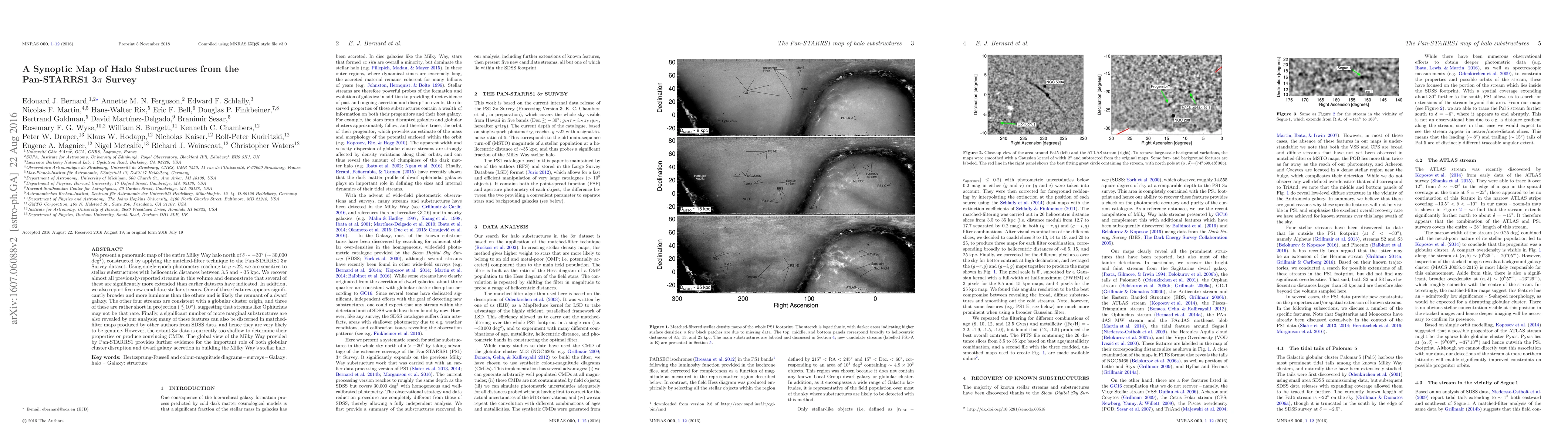 We present a panoramic map of the entire Milky Way halo north of dec~-30 degrees (~30,000 deg^2), constructed by applying the matched-filter technique to the Pan-STARRS1 3Pi Survey dataset. Using single-epoch photometry reaching to g~22, we are sensitive to stellar substructures with heliocentric distances between 3.5 and ~35 kpc. We recover almost all previously-reported streams in this volume and demonstrate that several of these are significantly more extended than earlier datasets have indicated. In addition, we also report five new candidate stellar streams. One of these features appears significantly broader and more luminous than the others and is likely the remnant of a dwarf galaxy. The other four streams are consistent with a globular cluster origin, and three of these are rather short in projection (<10 degrees), suggesting that streams like Ophiuchus may not be that rare. Finally, a significant number of more marginal substructures are also revealed by our analysis; many of these features can also be discerned in matched-filter maps produced by other authors from SDSS data, and hence they are very likely to be genuine. However, the extant 3Pi data is currently too shallow to determine their properties or produce convincing CMDs. The global view of the Milky Way provided by Pan-STARRS1 provides further evidence for the important role of both globular cluster disruption and dwarf galaxy accretion in building the Milky Way's stellar halo.