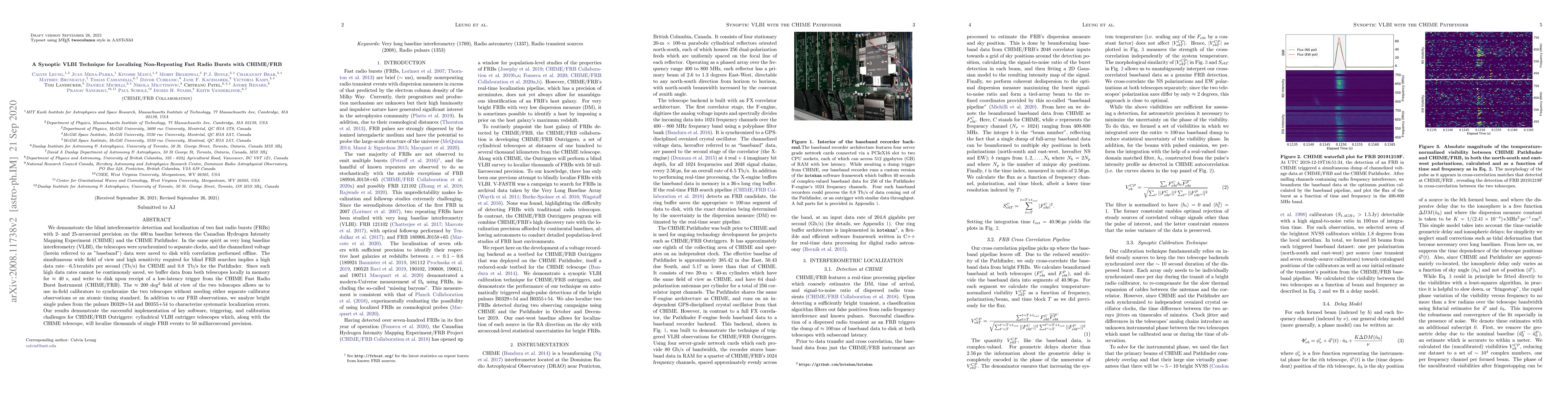 This paper presents a synoptic VLBI technique for localizing non-repeating fast radio bursts (FRBs) using CHIME/FRB, achieving 2- and 25-arcsecond precision. The method involves synchronizing CHIME and CHIME Pathfinder telescopes, buffering high data rates, and utilizing in-field calibrators for synchronization.