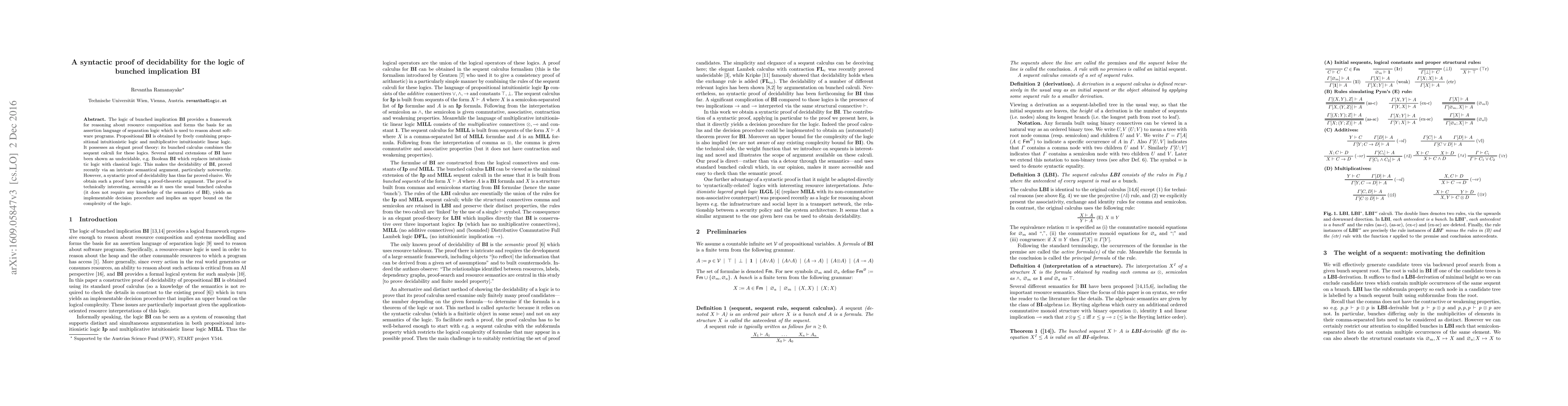 The paper presents a syntactic proof of decidability for the logic of bunched implication (BI), which is foundational for reasoning about resource composition in separation logic. The proof leverages the usual bunched calculus, providing an implementable decision procedure and establishing an upper bound on the logic's complexity.