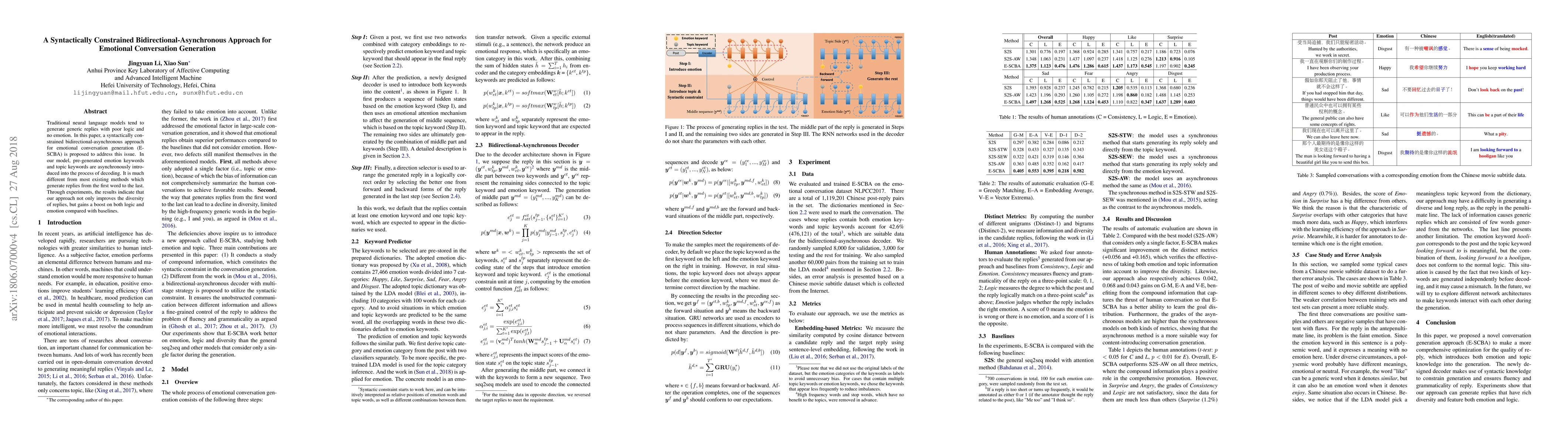 This paper proposes a syntactically constrained bidirectional-asynchronous approach (E-SCBA) for generating emotionally rich and logically sound conversational responses. Unlike traditional models, E-SCBA introduces emotion and topic keywords asynchronously during decoding, enhancing both the diversity and emotional depth of replies.