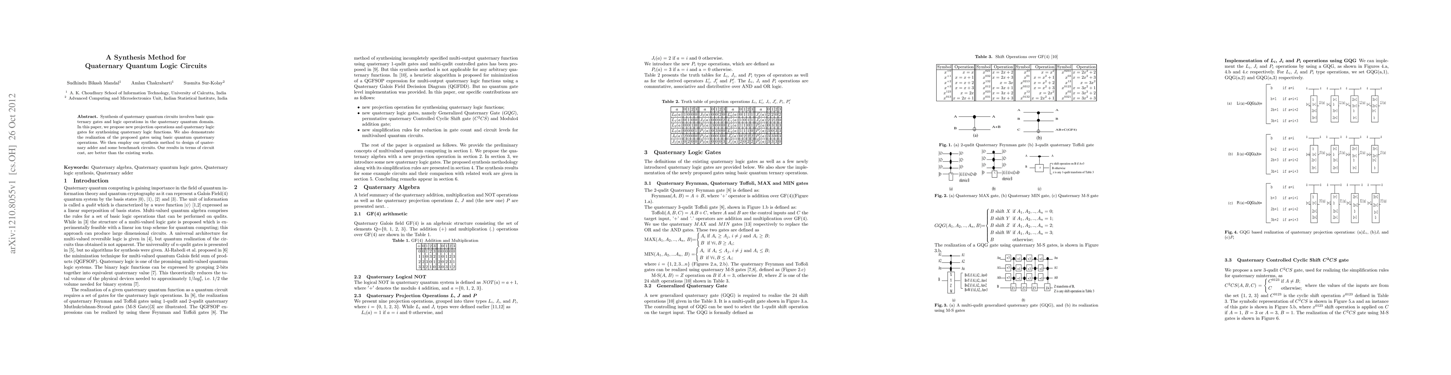 Synthesis of quaternary quantum circuits involves basic quaternary gates and logic operations in the quaternary quantum domain. In this paper, we propose new projection operations and quaternary logic gates for synthesizing quaternary logic functions. We also demonstrate the realization of the proposed gates using basic quantum quaternary operations. We then employ our synthesis method to design of quaternary adder and some benchmark circuits. Our results in terms of circuit cost, are better than the existing works.