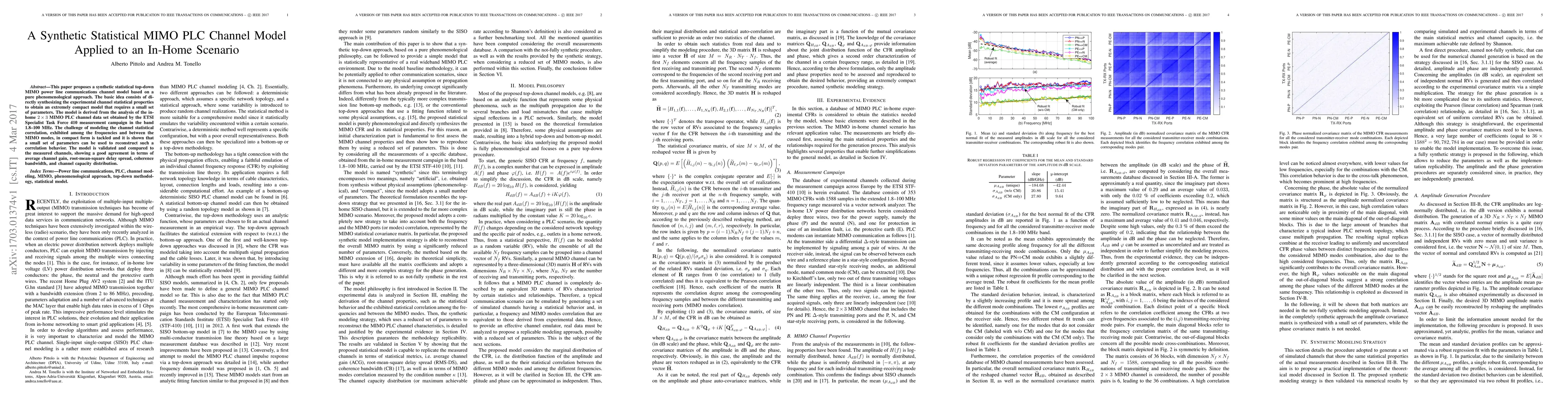 This paper proposes a synthetic statistical top-down MIMO power line communications channel model based on a pure phenomenological approach. The basic idea consists of directly synthesizing the experimental channel statistical properties to obtain an extremely compact model that requires a small set of parameters. The model is derived from the analysis of the in-home 2 $\times$ 3 MIMO PLC channel data set obtained by the ETSI Specialist Task Force 410 measurement campaign in the band 1.8-100 MHz. The challenge of modeling the channel statistical correlation, exhibited among the frequencies and between the MIMO modes, in compact form is tackled and it is shown that a small set of parameters can be used to reconstruct such a correlation behavior. The model is validated and compared to the measured channels, showing a good agreement in terms of average channel gain, root-mean-square delay spread, coherence bandwidth, and channel capacity distribution.