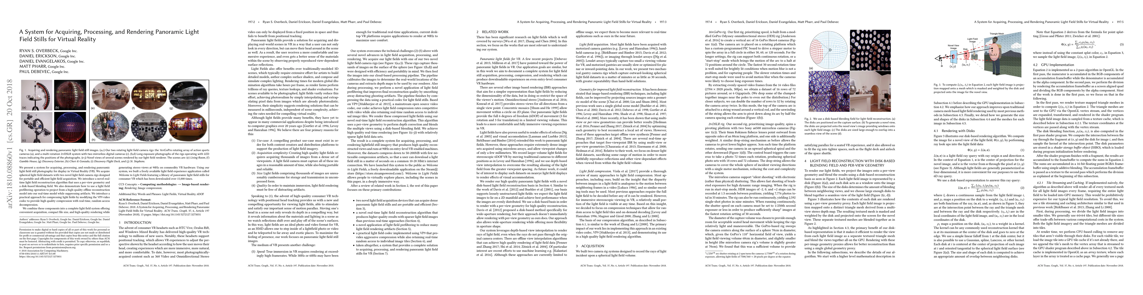 This research introduces a system for capturing, processing, and rendering panoramic light field stills for Virtual Reality. It details novel camera rigs for efficient acquisition, a real-time reconstruction algorithm, and a light field compression method using the VP9 codec. The system enables high-quality, stereo rendering at 90Hz on standard VR hardware, with a public light field application downloaded over 15,000 times.