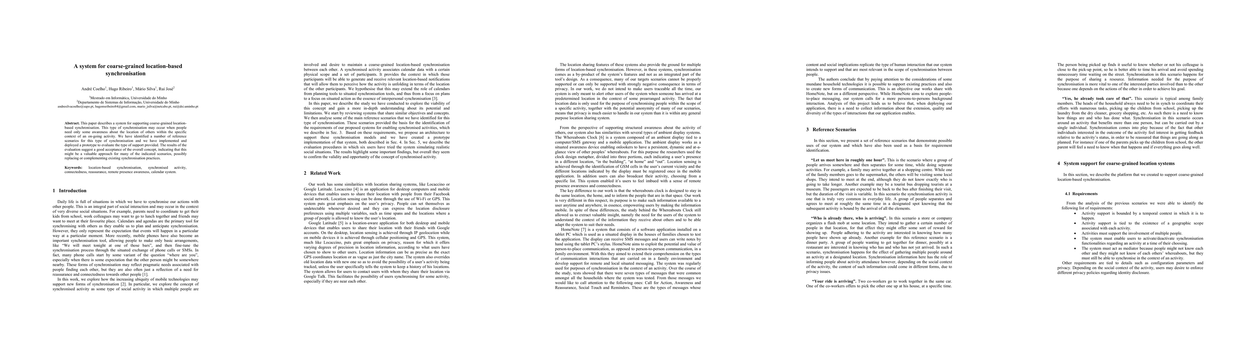 This paper describes a system for supporting coarse-grained location-based synchronisation. This type of synchronisation may occur when people need only some awareness about the location of others within the specific context of an on-going activity. We have identified a number of reference scenarios for this type of synchronisation and we have implemented and deployed a prototype to evaluate the type of support provided. The results of the evaluation suggest a good acceptance of the overall concept, indicating that this might be a valuable approach for many of the indicated scenarios, possibly replacing or complementing existing synchronisation practices.