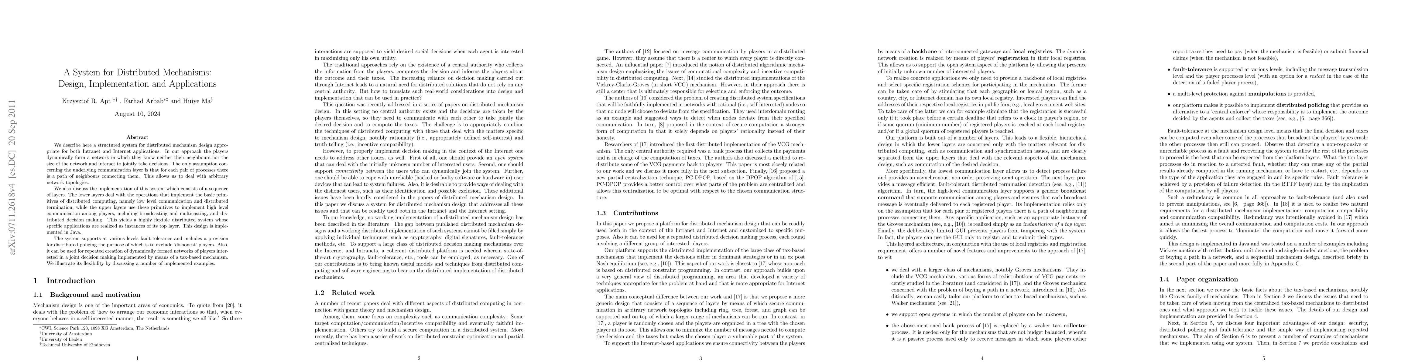 We describe here a structured system for distributed mechanism design appropriate for both Intranet and Internet applications. In our approach the players dynamically form a network in which they know neither their neighbours nor the size of the network and interact to jointly take decisions. The only assumption concerning the underlying communication layer is that for each pair of processes there is a path of neighbours connecting them. This allows us to deal with arbitrary network topologies. We also discuss the implementation of this system which consists of a sequence of layers. The lower layers deal with the operations that implement the basic primitives of distributed computing, namely low level communication and distributed termination, while the upper layers use these primitives to implement high level communication among players, including broadcasting and multicasting, and distributed decision making. This yields a highly flexible distributed system whose specific applications are realized as instances of its top layer. This design is implemented in Java. The system supports at various levels fault-tolerance and includes a provision for distributed policing the purpose of which is to exclude `dishonest' players. Also, it can be used for repeated creation of dynamically formed networks of players interested in a joint decision making implemented by means of a tax-based mechanism. We illustrate its flexibility by discussing a number of implemented examples.