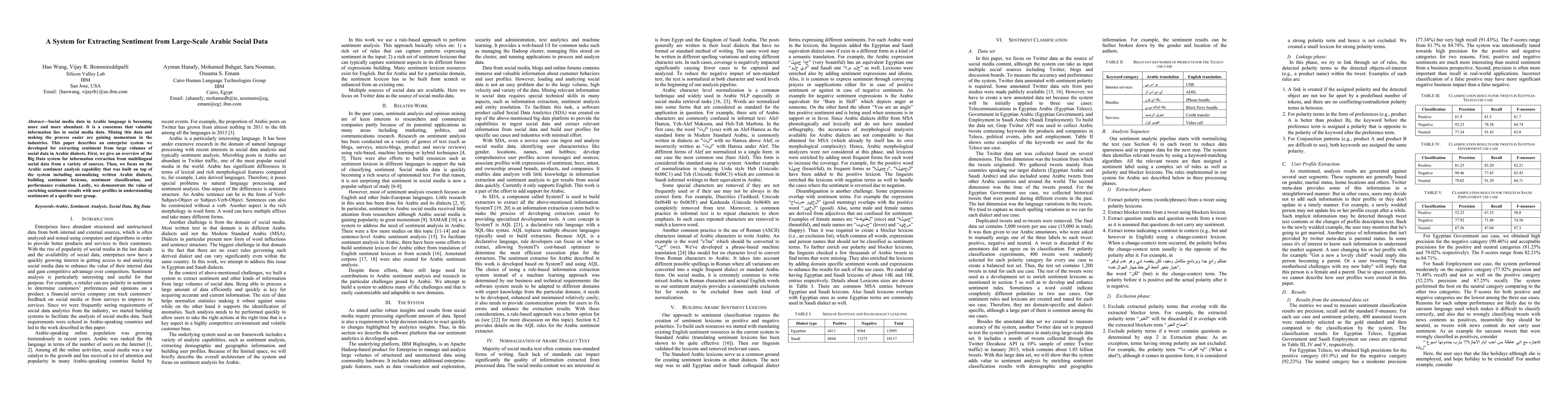 Social media data in Arabic language is becoming more and more abundant. It is a consensus that valuable information lies in social media data. Mining this data and making the process easier are gaining momentum in the industries. This paper describes an enterprise system we developed for extracting sentiment from large volumes of social data in Arabic dialects. First, we give an overview of the Big Data system for information extraction from multilingual social data from a variety of sources. Then, we focus on the Arabic sentiment analysis capability that was built on top of the system including normalizing written Arabic dialects, building sentiment lexicons, sentiment classification, and performance evaluation. Lastly, we demonstrate the value of enriching sentiment results with user profiles in understanding sentiments of a specific user group.