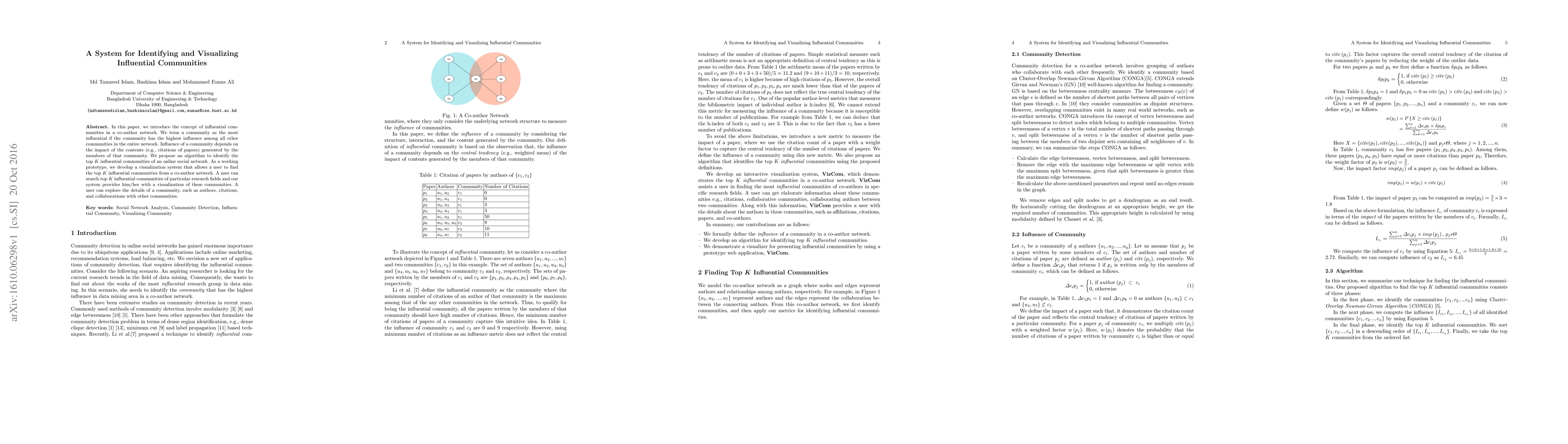 This paper proposes an algorithm to identify the top K most influential communities in a co-author network based on the impact of their scholarly contributions. It also presents a visualization system to explore these communities, allowing users to delve into details like authors, citations, and inter-community collaborations.
