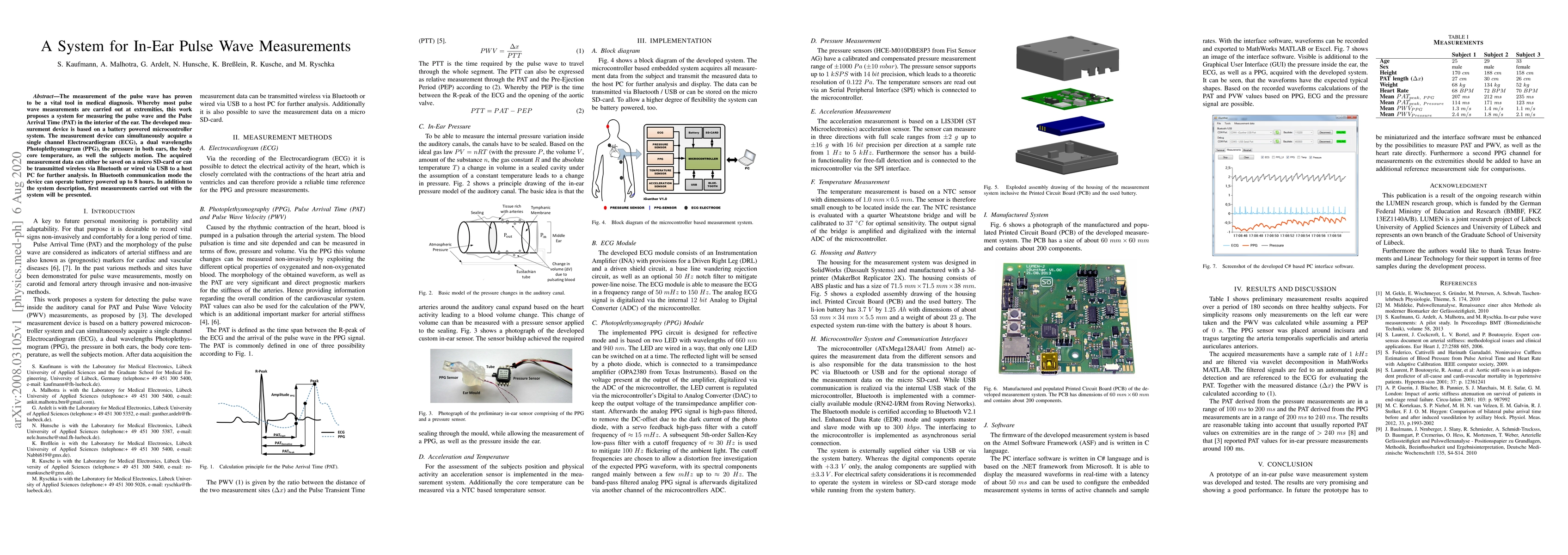 The measurement of the pulse wave has proven to be a vital tool in medical diagnosis. Whereby most pulse wave measurements are carried out at extremities, this work proposes a system for measuring the pulse wave and the Pulse Arrival Time (PAT) in the interior of the ear. The developed measurement device is based on a battery powered microcontroller system. The measurement device can simultaneously acquire a single channel Electrocardiogram (ECG), a dual wavelengths Photoplethysmogram (PPG), the pressure in both ears, the body core temperature, as well the subjects motion. The acquired measurement data can either be saved on a micro SD-card or can be transmitted wireless via Bluetooth or wired via USB to a host PC for further analysis. In Bluetooth communication mode the device can operate battery powered up to 8 hours. In addition to the system description, first measurements carried out with the system will be presented.
