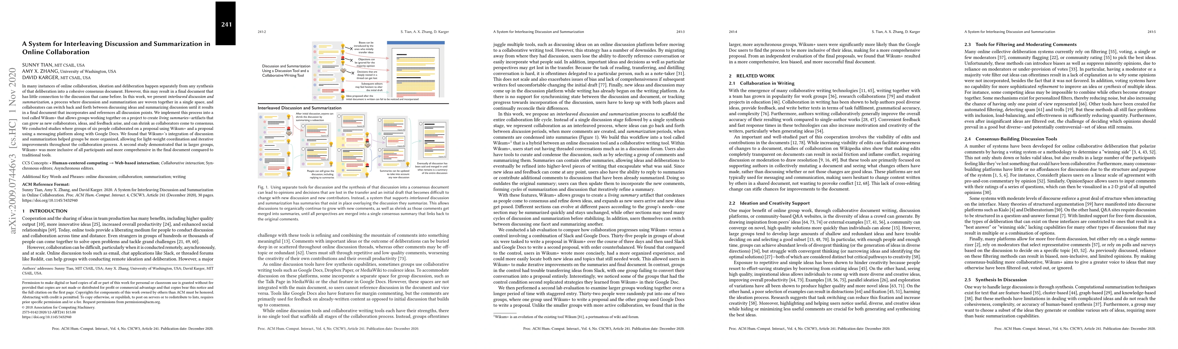 In many instances of online collaboration, ideation and deliberation about what to write happen separately from the synthesis of the deliberation into a cohesive document. However, this may result in a final document that has little connection to the discussion that came before. In this work, we present interleaved discussion and summarization, a process where discussion and summarization are woven together in a single space, and collaborators can switch back and forth between discussing ideas and summarizing discussion until it results in a final document that incorporates and references all discussion points. We implement this process into a tool called Wikum+ that allows groups working together on a project to create living summaries-artifacts that can grow as new collaborators, ideas, and feedback arise and shrink as collaborators come to consensus. We conducted studies where groups of six people each collaboratively wrote a proposal using Wikum+ and a proposal using a messaging platform along with Google Docs. We found that Wikum+'s integration of discussion and summarization helped users be more organized, allowing for light-weight coordination and iterative improvements throughout the collaboration process. A second study demonstrated that in larger groups, Wikum+ is more inclusive of all participants and more comprehensive in the final document compared to traditional tools.