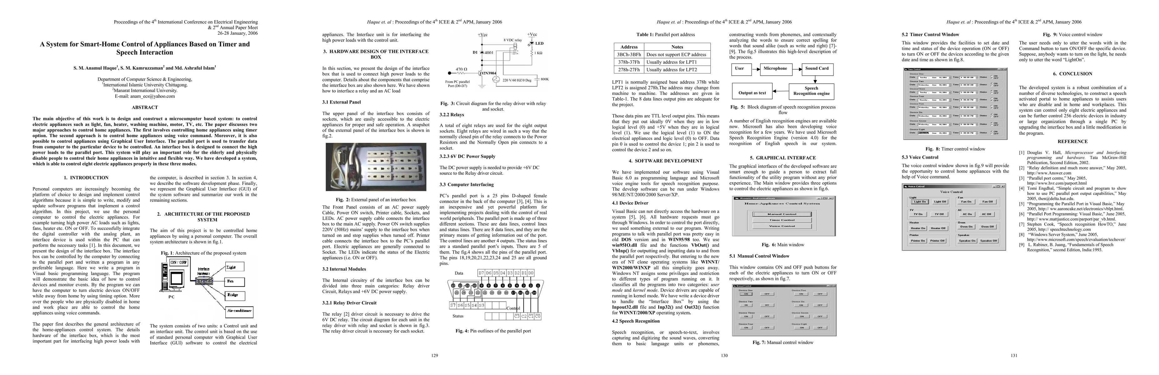 This research develops a microcomputer-based system for controlling electric appliances via timer, speech, and GUI. The system aims to assist elderly and disabled individuals by enabling intuitive control of eight appliances through these three modes.