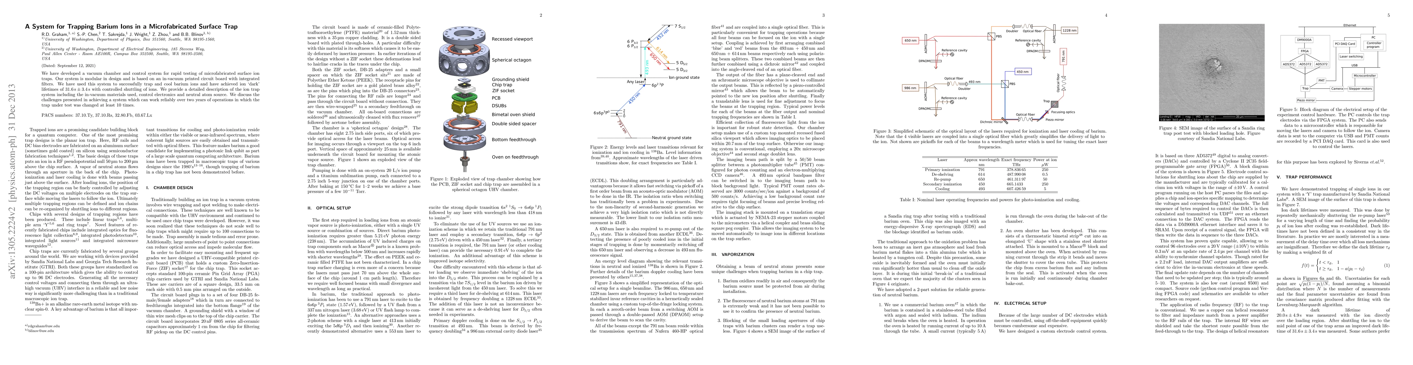 This paper describes a modular vacuum chamber system for testing microfabricated surface ion traps, successfully trapping and cooling barium ions with a 'dark' lifetime of 31.6 s ± 3.4 s. The system's reliability over two years of operation with frequent trap changes is highlighted.