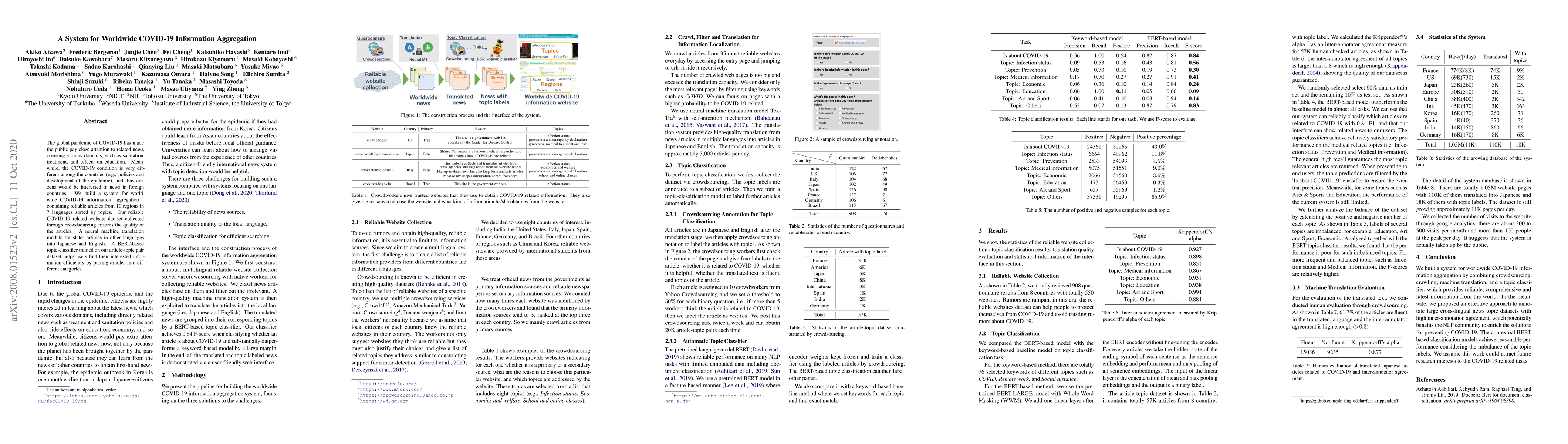 The paper presents a worldwide COVID-19 information aggregation system that collects reliable articles from 10 regions in 7 languages, translated into Japanese and English, and categorizes them using a BERT-based topic classifier for efficient topic-specific access. The system aims to provide diverse and high-quality information on the pandemic globally.
