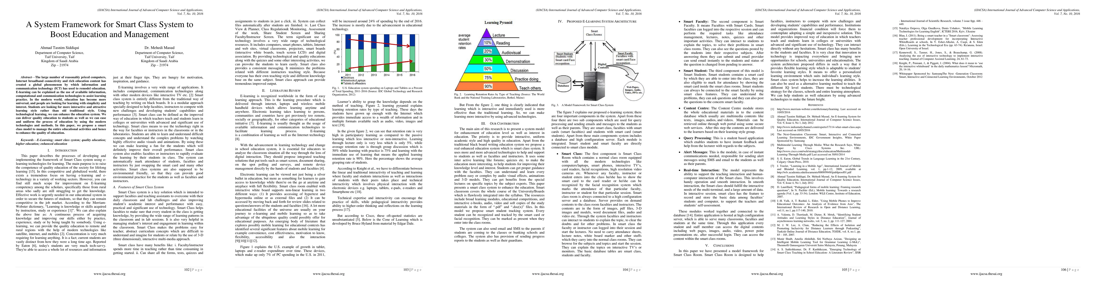 The large number of reasonably priced computers, Internet broadband connectivity and rich education content has created a global phenomenon by which information and communication technology (ICT) has used to remodel education. E-learning can be explained as the use of available information, computational and communication technologies to assist learning practice. In the modern world, education has become more universal, and people are looking for learning with simplicity and interest. Students are looking for more interactive and attractive learning style rather than old traditional style. Using technological learning, we can enhance the education system. We can deliver quality education to students as well as we can ease and uniform the process of education by using the modern technologies and methods. In this paper, we propose a smart class model to manage the entire educational activities and hence to enhance the quality of education.