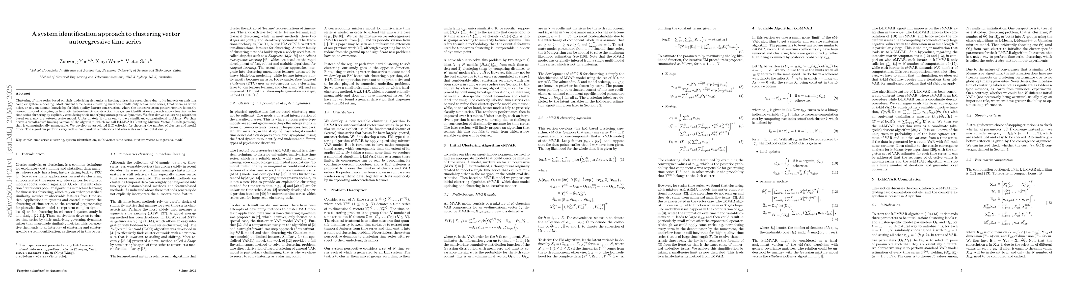The paper proposes a system identification approach for clustering vector autoregressive time series, deriving a clustering algorithm based on a mixture autoregressive model and a computationally manageable 'small-noise' limiting version called k-LMVAR, accompanied by a BIC criterion for selecting clusters and model order.