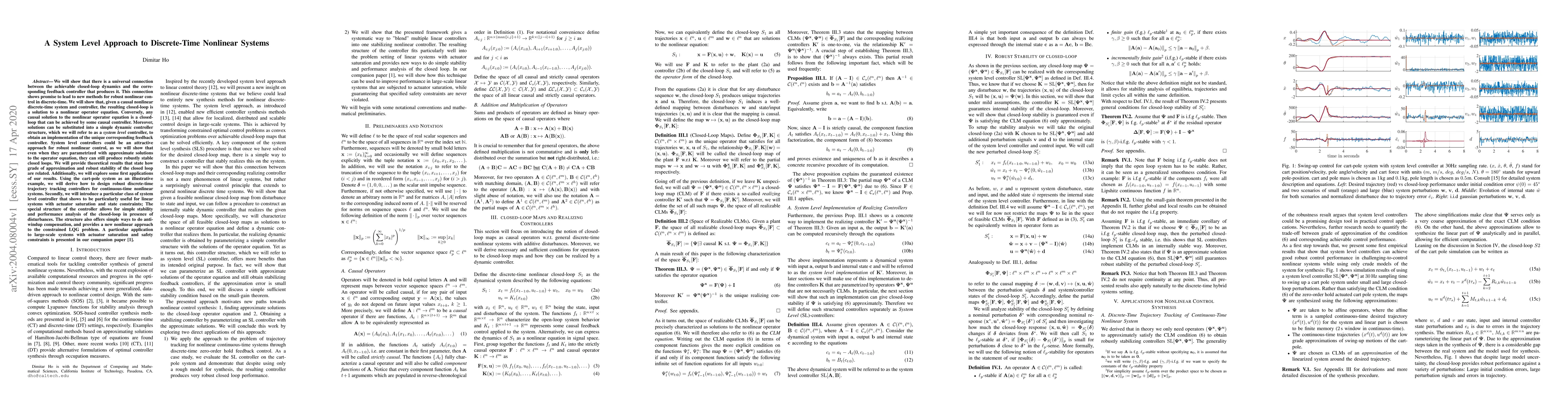 We will show that there is a universal connection between the achievable closed-loop dynamics and the corresponding feedback controller that produces it. This connection shows promise to lead to new methods for robust nonlinear control in discrete-time. We will show that, given a causal nonlinear discrete-time system and controller, the resulting closed-loop is a solution to a nonlinear operator equation. Conversely, any causal solution to the nonlinear operator equation is a closed-loop that can be achieved by some causal controller. Moreover, solutions can be substituted into a simple dynamic controller structure, which we will refer to as a system level controller, to obtain an implementation of the unique corresponding feedback controller. System level controllers could be an attractive approach for robust nonlinear control, as we will show that even when they are parametrized with approximate solutions to the operator equation, they can still produce robustly stable closed loops. We will provide theoretical results that state how grade of approximation and robust stability of the closed loop are related. Additionally, we will explore some first applications of our results. Using the cart-pole system as an illustrative example, we will derive how to design robust discrete-time trajectory tracking controllers for continuous-time nonlinear systems. Secondly, we will introduce a particular class of system level controller that shows to be particularly useful for linear systems with actuator saturation and state constraints. The special structure of the controller allows for simple stability and performance analysis of the closed-loop in presence of disturbances. A particular application to large-scale systems with actuator saturation and safety constraints is presented in our companion paper.