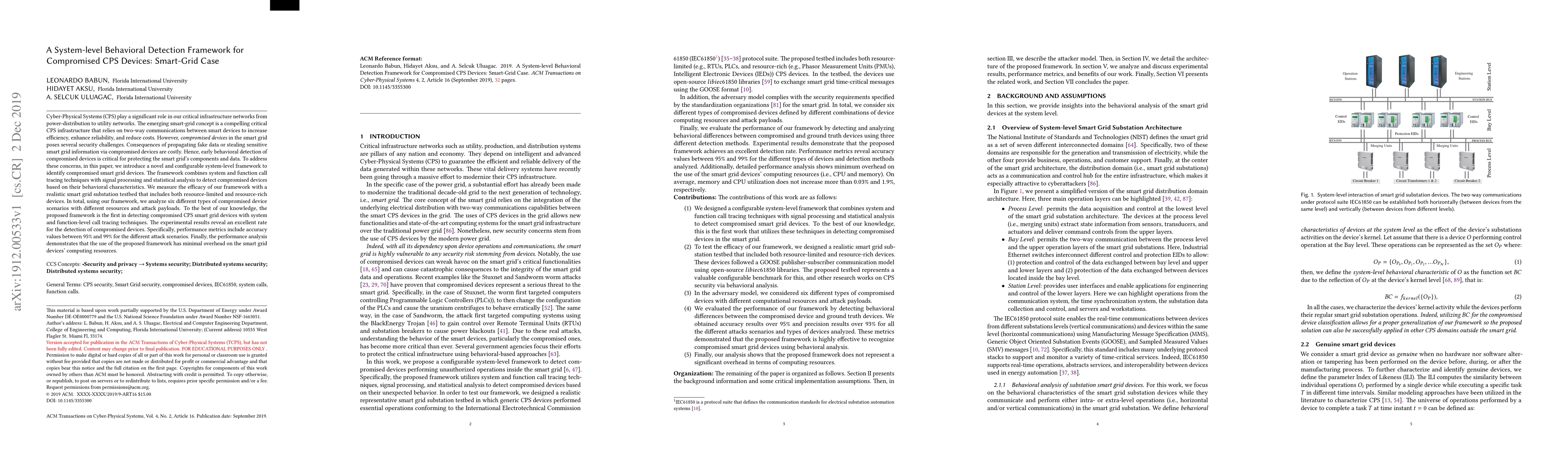 This paper introduces a novel system-level behavioral detection framework to identify compromised devices in smart grid CPS, combining system and function call tracing with signal processing and statistical analysis. Experimental results show high detection accuracy (95%-99%) and minimal resource overhead.