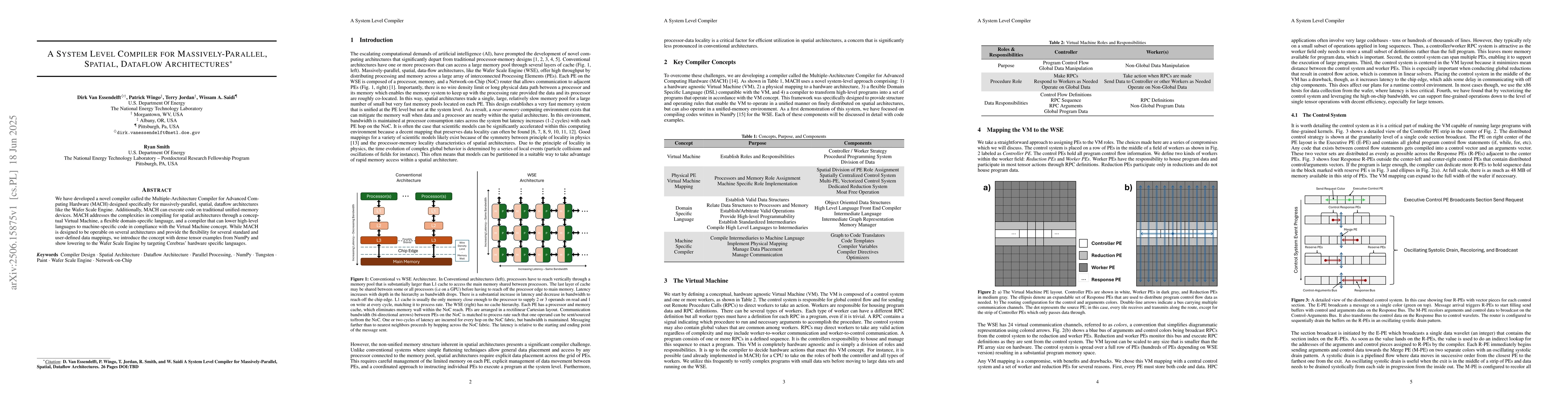 The research introduces MACH, a compiler for massively-parallel, spatial dataflow architectures like the Wafer Scale Engine, also compatible with traditional devices. It simplifies compilation complexities via a Virtual Machine, domain-specific language, and code lowering to machine-specific instructions, demonstrated with dense tensor examples and Cerebras' hardware languages.