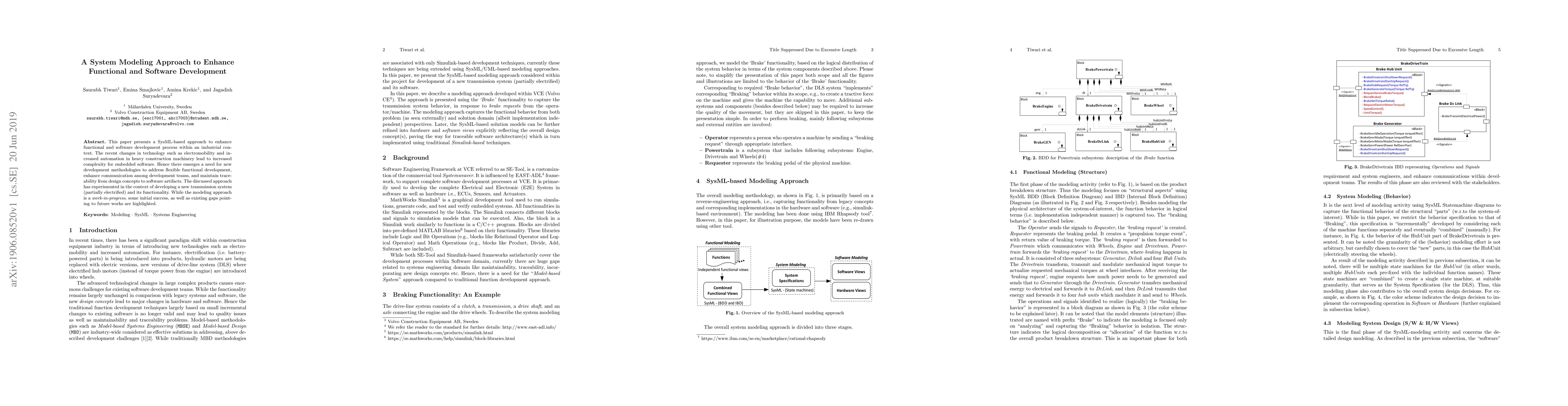 This paper presents a SysML-based approach to enhance functional and software development process within an industrial context. The recent changes in technology such as electromobility and increased automation in heavy construction machinery lead to increased complexity for embedded software. Hence there emerges a need for new development methodologies to address flexible functional development, enhance communication among development teams, and maintain traceability from design concepts to software artefacts. The discussed approach has experimented in the context of developing a new transmission system (partially electrified) and its functionality. While the modeling approach is a work-in-progress, some initial success, as well as existing gaps pointing to future works are highlighted.