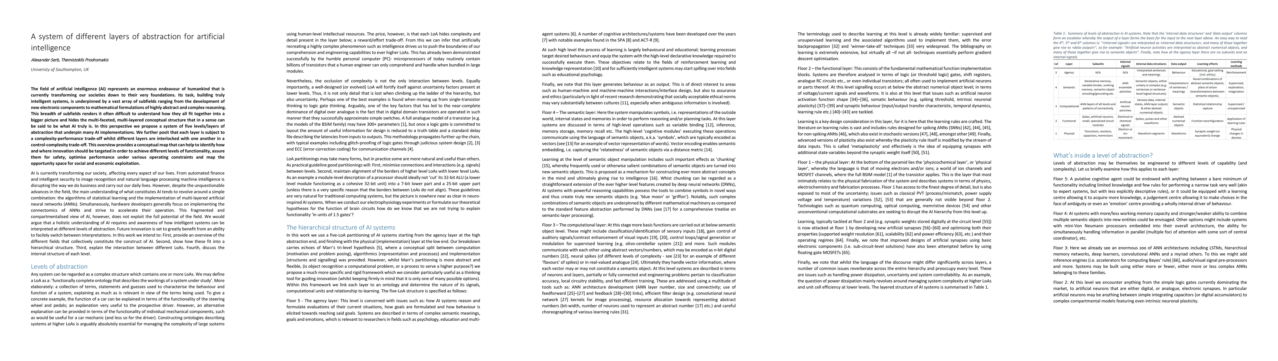 The paper proposes a system of five levels/layers of abstraction for artificial intelligence, analyzing AI implementations in terms of complexity-performance trade-offs and control-complexity trade-offs between layers.