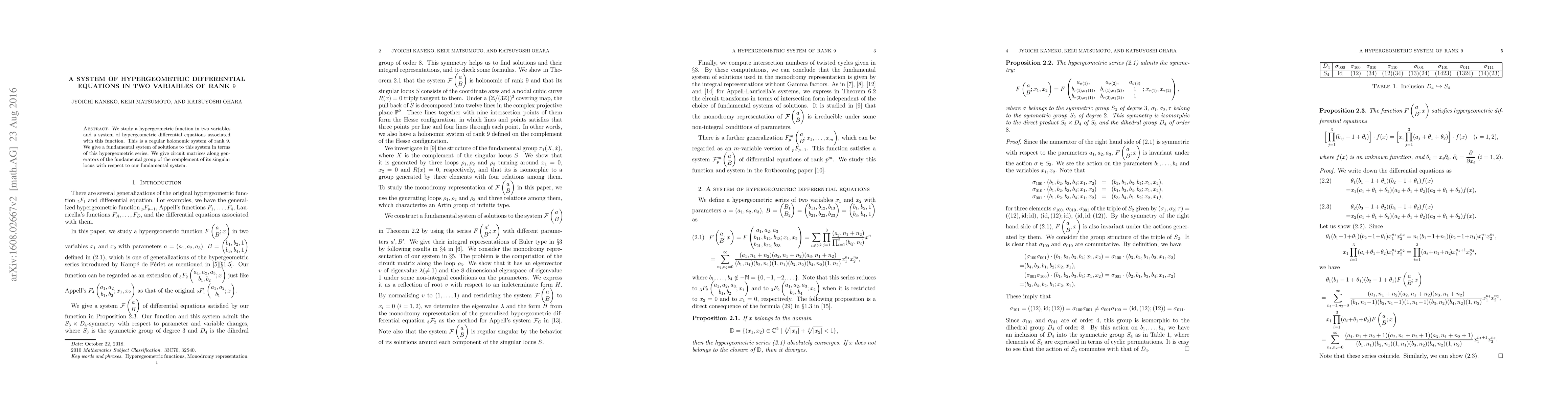 We study a hypergeometric function in two variables and a system of hypergeometric differential equations associated with this function. This is a regular holonomic system of rank $9$. We give a fundamental system of solutions to this system in terms of this hypergeometric series. We give circuit matrices along generators of the fundamental group of the complement of its singular locus with respect to our fundamental system.