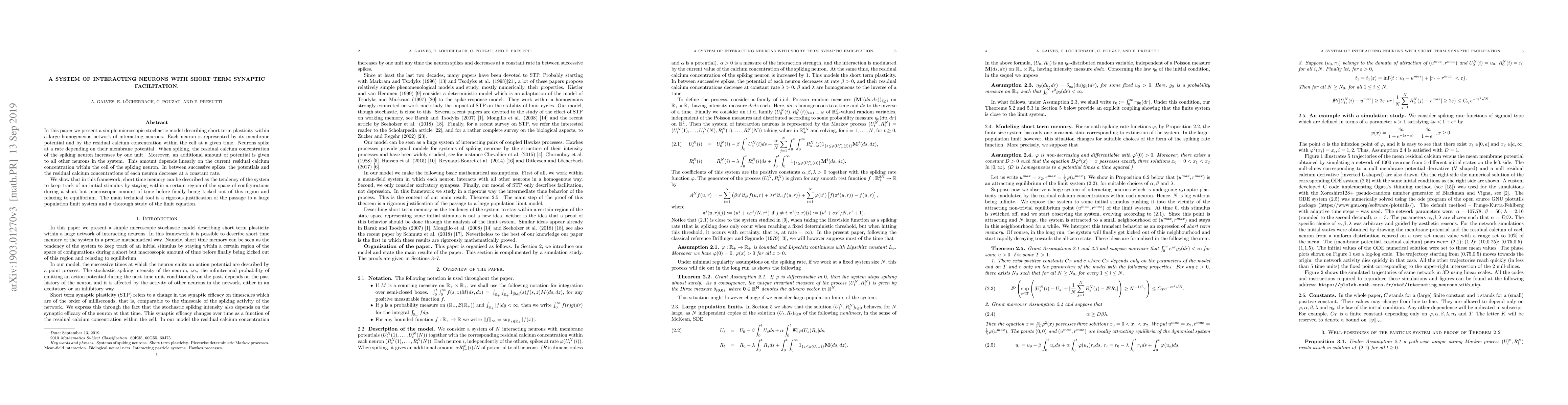 In this paper we present a simple microscopic stochastic model describing short term plasticity within a large homogeneous network of interacting neurons. Each neuron is represented by its membrane potential and by the residual calcium concentration within the cell at a given time. Neurons spike at a rate depending on their membrane potential. When spiking, the residual calcium concentration of the spiking neuron increases by one unit. Moreover, an additional amount of potential is given to all other neurons in the system. This amount depends linearly on the current residual calcium concentration within the cell of the spiking neuron. In between successive spikes, the potentials and the residual calcium concentrations of each neuron decrease at a constant rate. We show that in this framework, short time memory can be described as the tendency of the system to keep track of an initial stimulus by staying within a certain region of the space of configurations during a short but macroscopic amount of time before finally being kicked out of this region and relaxing to equilibrium. The main technical tool is a rigorous justification of the passage to a large population limit system and a thorough study of the limit equation.