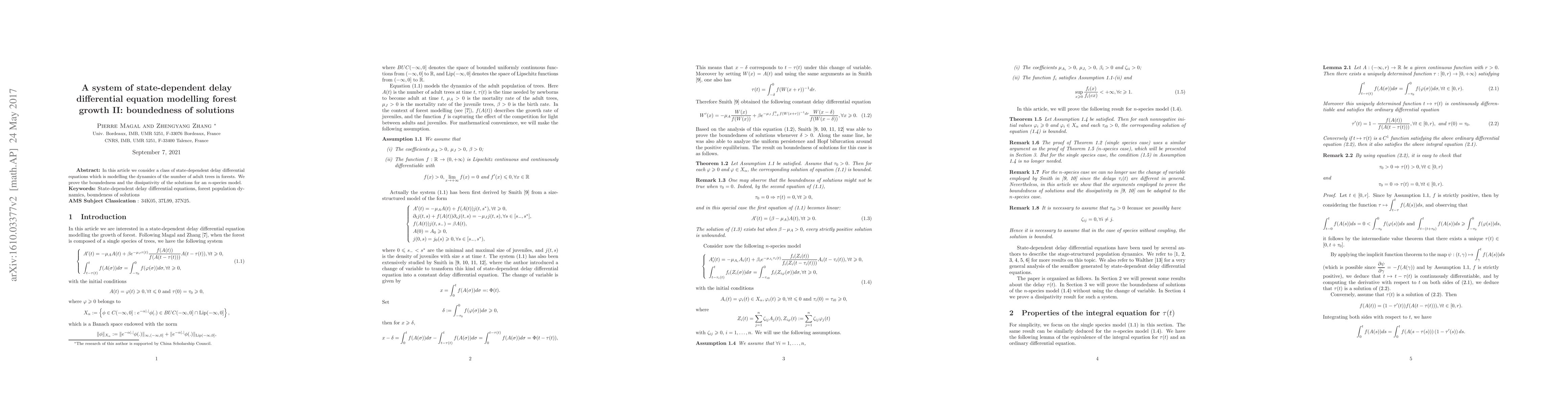 In this article we consider a class of state-dependent delay differential equations which is modelling the dynamics of the number of adult trees in forests. We prove the boundedness of solutions for a single species model as well as a two-species model.