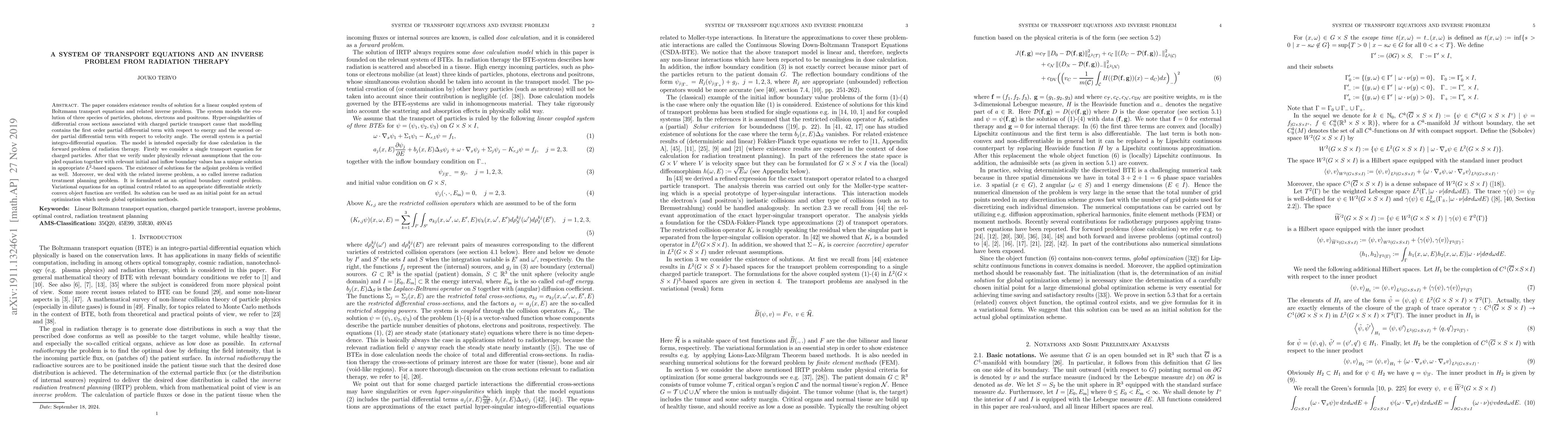 The paper presents a mathematical model, a coupled system of transport equations, for simulating particle behavior in radiation therapy, involving photons, electrons, and positrons. It proves the existence of unique solutions for this model under specific conditions, and also addresses an inverse problem in radiation treatment planning, formulated as an optimal boundary control problem. The solution to this problem can serve as a starting point for global optimization methods.