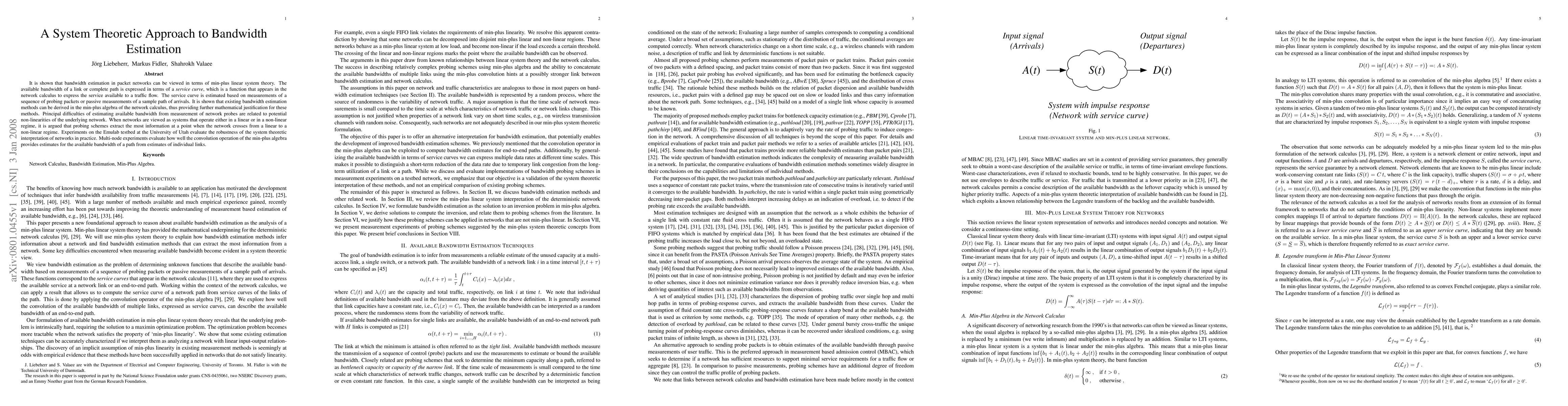 It is shown that bandwidth estimation in packet networks can be viewed in terms of min-plus linear system theory. The available bandwidth of a link or complete path is expressed in terms of a {\em service curve}, which is a function that appears in the network calculus to express the service available to a traffic flow. The service curve is estimated based on measurements of a sequence of probing packets or passive measurements of a sample path of arrivals. It is shown that existing bandwidth estimation methods can be derived in the min-plus algebra of the network calculus, thus providing further mathematical justification for these methods. Principal difficulties of estimating available bandwidth from measurement of network probes are related to potential non-linearities of the underlying network. When networks are viewed as systems that operate either in a linear or in a non-linear regime, it is argued that probing schemes extract the most information at a point when the network crosses from a linear to a non-linear regime. Experiments on the Emulab testbed at the University of Utah evaluate the robustness of the system theoretic interpretation of networks in practice. Multi-node experiments evaluate how well the convolution operation of the min-plus algebra provides estimates for the available bandwidth of a path from estimates of individual links.