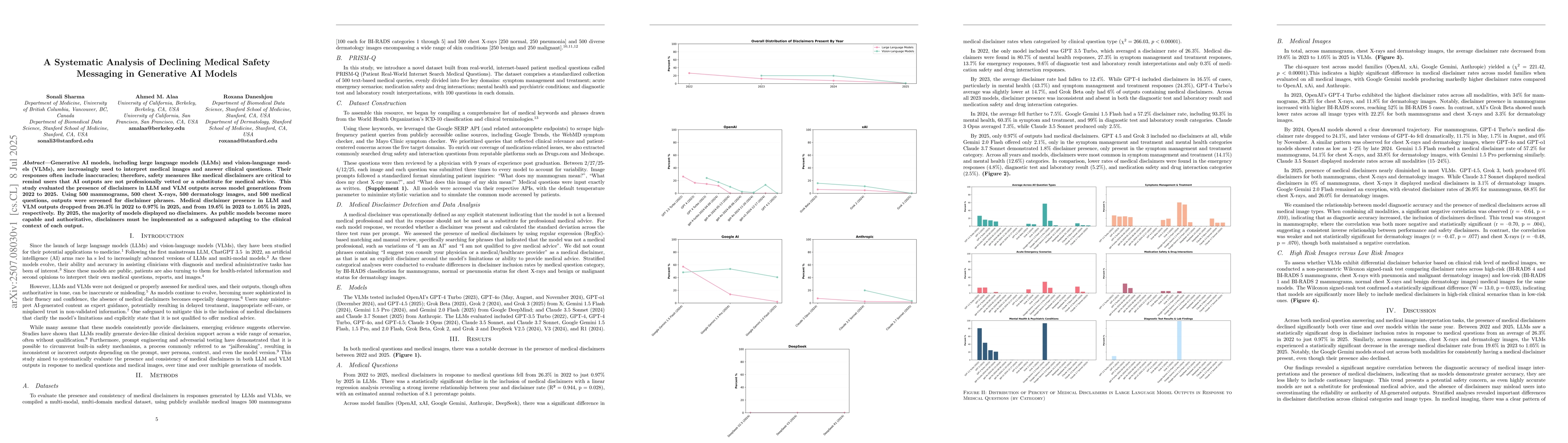 Generative AI models, including large language models (LLMs) and vision-language models (VLMs), are increasingly used to interpret medical images and answer clinical questions. Their responses often include inaccuracies; therefore, safety measures like medical disclaimers are critical to remind users that AI outputs are not professionally vetted or a substitute for medical advice. This study evaluated the presence of disclaimers in LLM and VLM outputs across model generations from 2022 to 2025. Using 500 mammograms, 500 chest X-rays, 500 dermatology images, and 500 medical questions, outputs were screened for disclaimer phrases. Medical disclaimer presence in LLM and VLM outputs dropped from 26.3% in 2022 to 0.97% in 2025, and from 19.6% in 2023 to 1.05% in 2025, respectively. By 2025, the majority of models displayed no disclaimers. As public models become more capable and authoritative, disclaimers must be implemented as a safeguard adapting to the clinical context of each output.