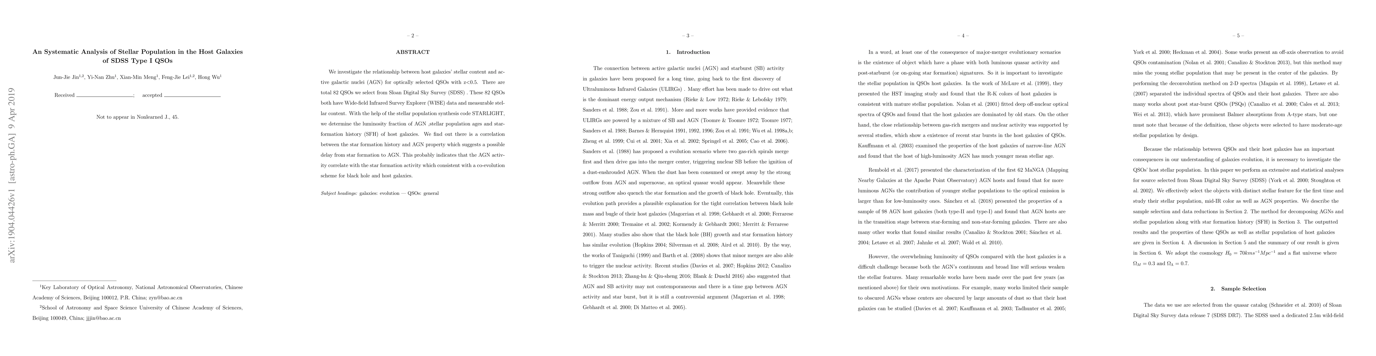 We investigate the relationship between host galaxies' stellar content and active galactic nuclei (AGN) for optically selected QSOs with z$<$0.5. There are total 82 QSOs we select from Sloan Digital Sky Survey (SDSS) . These 82 QSOs both have Wide-field Infrared Survey Explorer (WISE) data and measurable stellar content. With the help of the stellar population synthesis code STARLIGHT, we determine the luminosity fraction of AGN ,stellar population ages and star-formation history (SFH) of host galaxies. We find out there is a correlation between the star formation history and AGN property which suggests a possible delay from star formation to AGN. This probably indicates that the AGN activity correlate with the star formation activity which consistent with a co-evolution scheme for black hole and host galaxies.
