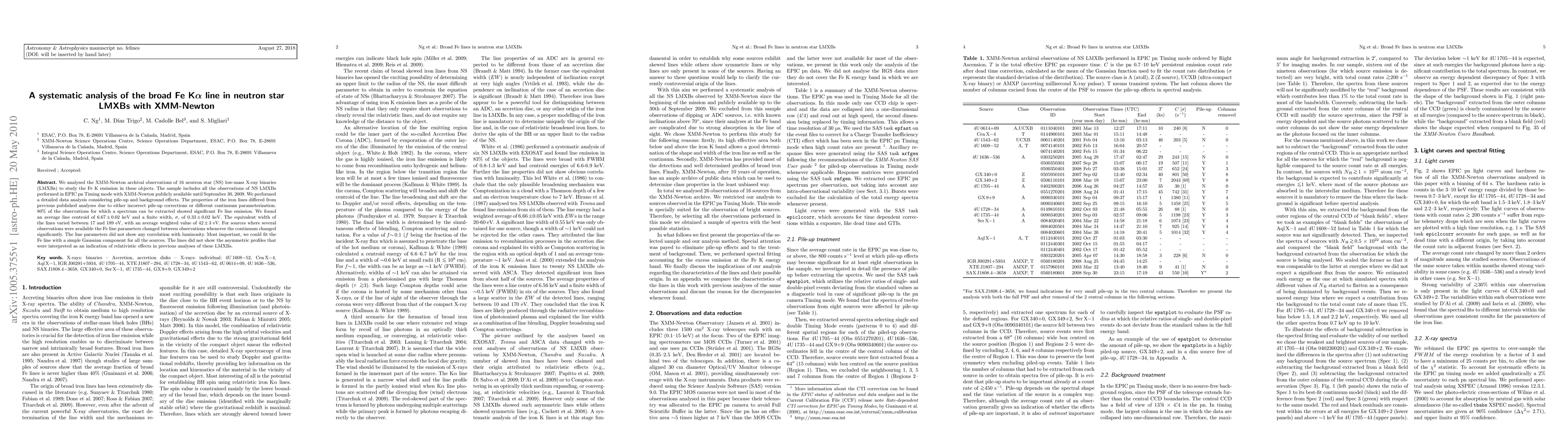 This study analyzed XMM-Newton observations of 16 neutron star low-mass X-ray binaries to investigate Fe Kα emission, finding significant Fe line emission in 80% of the cases. The average line centroid was 6.67 keV with a width of 0.33 keV, and the lines did not exhibit the previously reported asymmetric profiles indicative of relativistic effects.