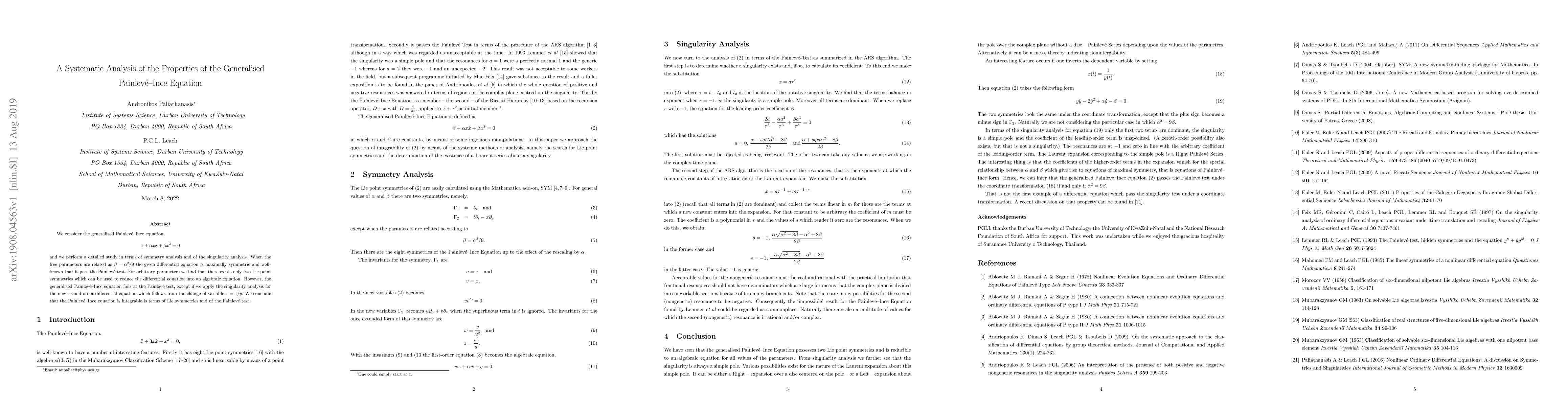 This paper conducts a systematic analysis of the generalized Painlevé-Ince equation, revealing that it is maximally symmetric and passes the Painlevé test when parameters are related as $\beta = \alpha^2/9$. For arbitrary parameters, only two Lie point symmetries exist, reducing the equation to an algebraic form.