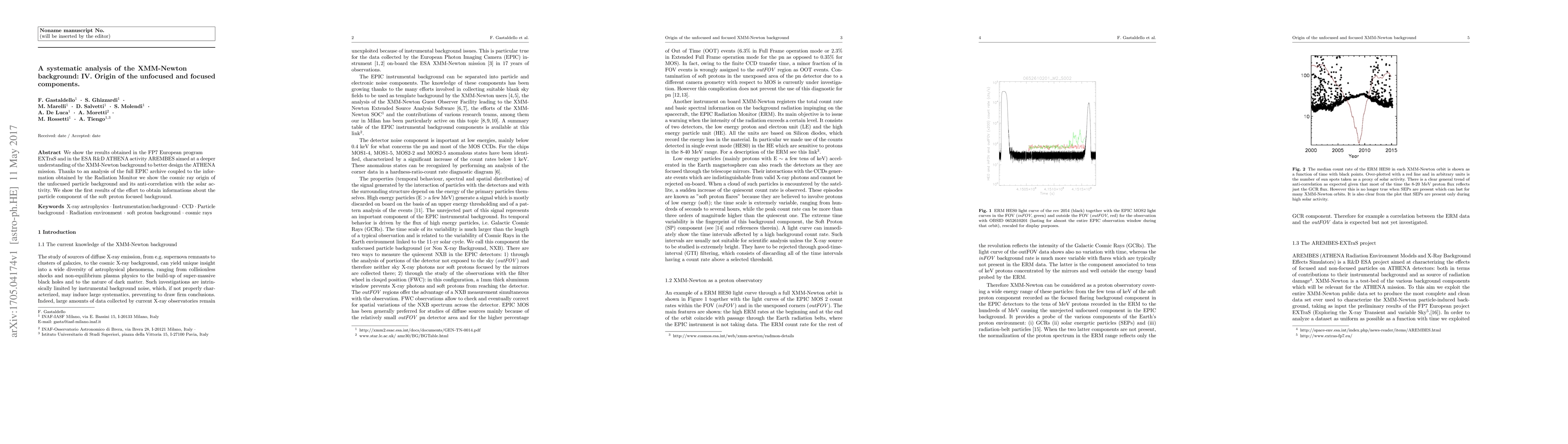 This paper investigates the origins of the unfocused and focused components of the XMM-Newton background, attributing the unfocused particle background to cosmic rays and noting its anti-correlation with solar activity. Initial findings on the particle component of the soft proton focused background are also presented.