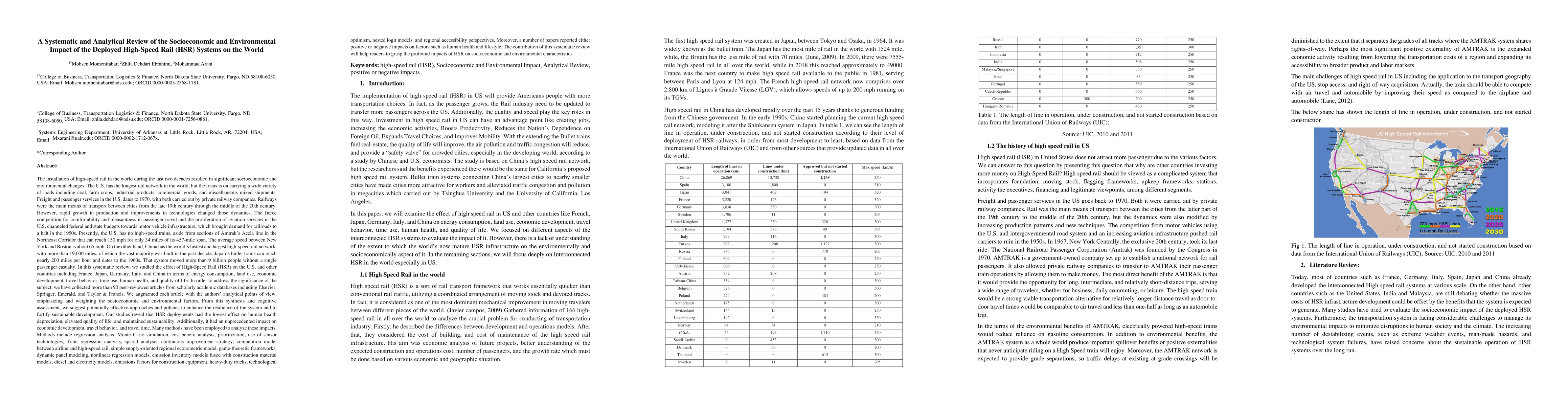 The installation of high-speed rail in the world during the last two decades resulted in significant socioeconomic and environmental changes. The U.S. has the longest rail network in the world, but the focus is on carrying a wide variety of loads including coal, farm crops, industrial products, commercial goods, and miscellaneous mixed shipments. Freight and passenger services in the U.S. dates to 1970, with both carried out by private railway companies. Railways were the main means of transport between cities from the late 19th century through the middle of the 20th century. However, rapid growth in production and improvements in technologies changed those dynamics. The fierce competition for comfortability and pleasantness in passenger travel and the proliferation of aviation services in the U.S. channeled federal and state budgets towards motor vehicle infrastructure, which brought demand for railroads to a halt in the 1950s. Presently, the U.S. has no high-speed trains, aside from sections of Amtrak s Acela line in the Northeast Corridor that can reach 150 mph for only 34 miles of its 457-mile span. The average speed between New York and Boston is about 65 mph. On the other hand, China has the world s fastest and largest high-speed rail network, with more than 19,000 miles, of which the vast majority was built in the past decade. Japan s bullet trains can reach nearly 200 miles per hour and dates to the 1960s. That system moved more than 9 billion people without a single passenger casualty. In this systematic review, we studied the effect of High-Speed Rail (HSR) on the U.S. and other countries including France, Japan, Germany, Italy, and China in terms of energy consumption, land use, economic development, travel behavior, time use, human health, and quality of life.