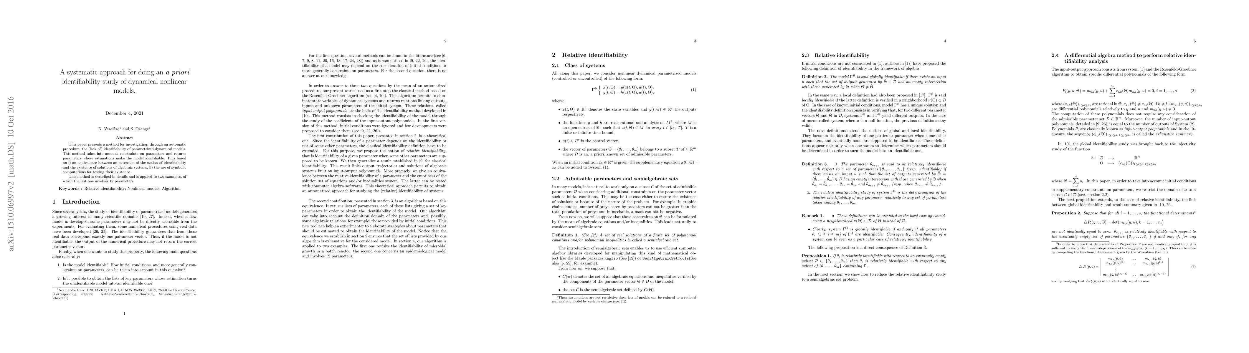 Researchers developed a method to identify if dynamical nonlinear models can be estimated with a specific set of parameters, and found it to be effective in identifying the identifiable parameters for two examples.