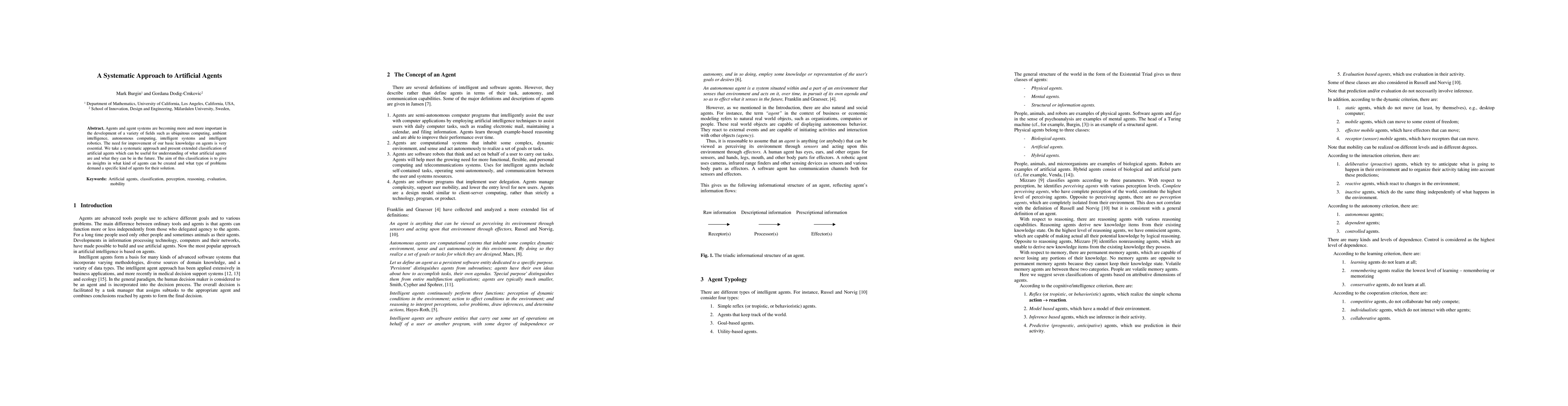 Agents and agent systems are becoming more and more important in the development of a variety of fields such as ubiquitous computing, ambient intelligence, autonomous computing, intelligent systems and intelligent robotics. The need for improvement of our basic knowledge on agents is very essential. We take a systematic approach and present extended classification of artificial agents which can be useful for understanding of what artificial agents are and what they can be in the future. The aim of this classification is to give us insights in what kind of agents can be created and what type of problems demand a specific kind of agents for their solution.